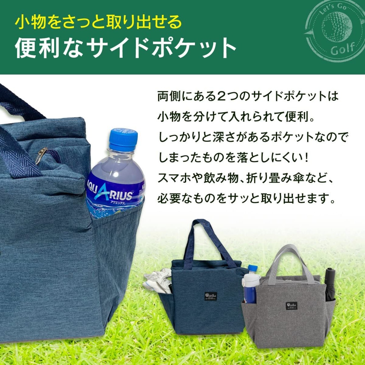 【しっかりはいるメイン収納】500mlペットボトルがぴったり6本入る大容量!ラウンド中に必要な小物をひとまとめにして持ち運ぶことが出来ます。【サッと取り出せるサイドポケット】両側にある2つのポケットは小物を分けて入れられる。スマホや飲み物など必要なものをすぐ取り出せて便利!