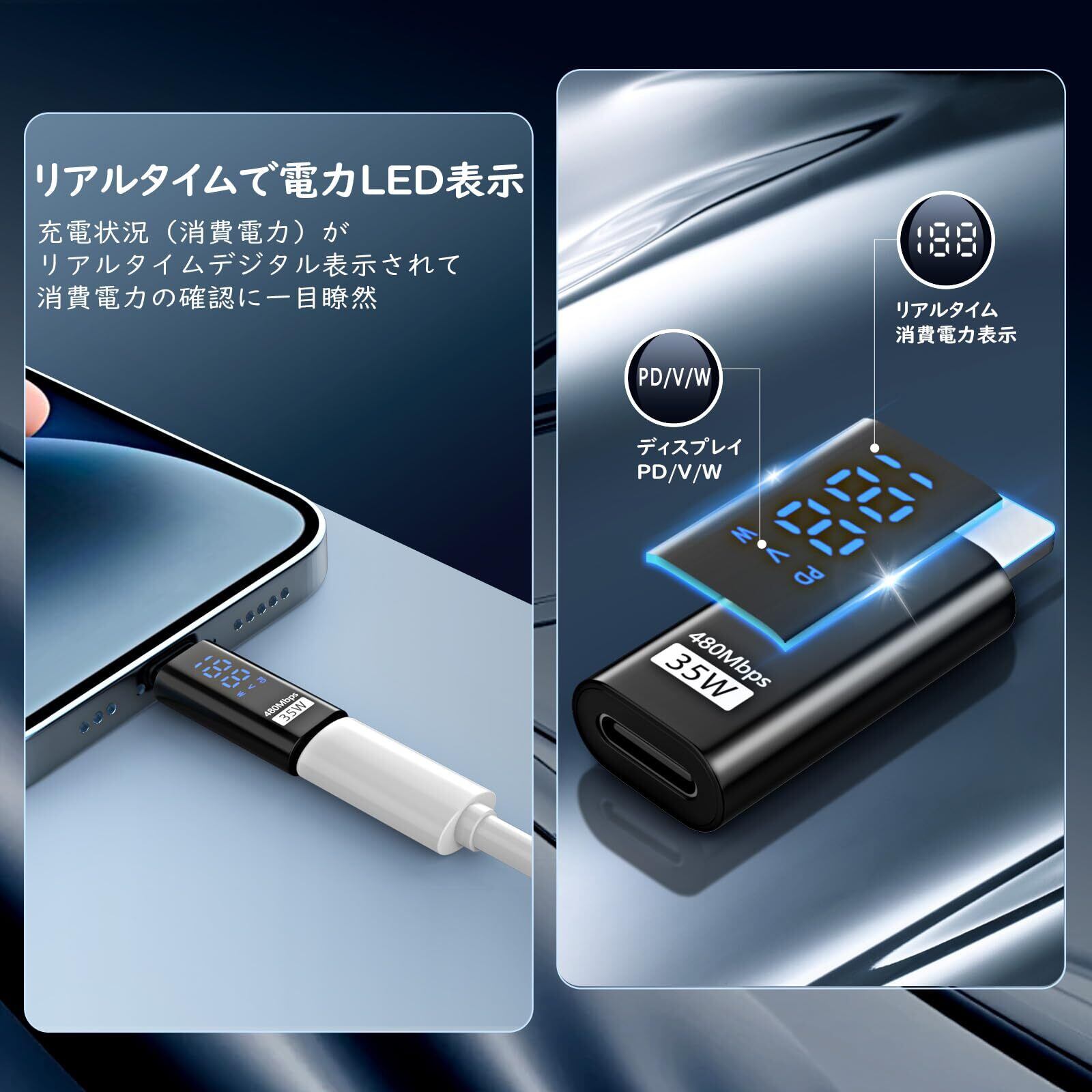 「電力をリアルタイムでLED表示」PD自動認識チップ搭載されてあり、充電状況(消費電力)のワット数とボルト数を0.1単位で最大35Wに達するリアルタイムデジタル表示される革新なLEDディスプレイ機能搭載してあり、PD充電が行われているか、消費電力の確認などに一目瞭然で、充電やデータ転送などの作業をより快く行えます。