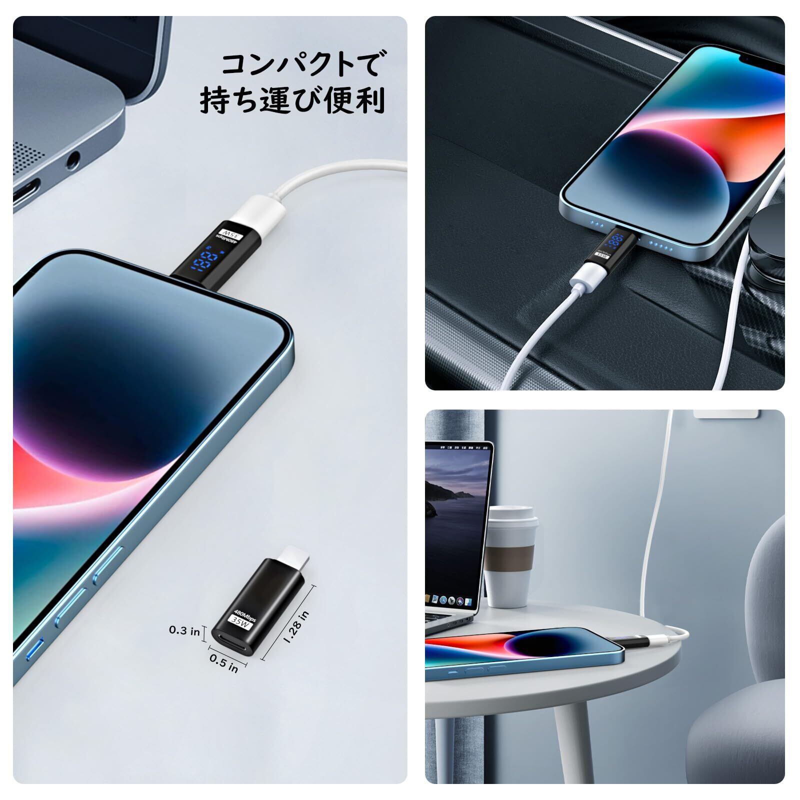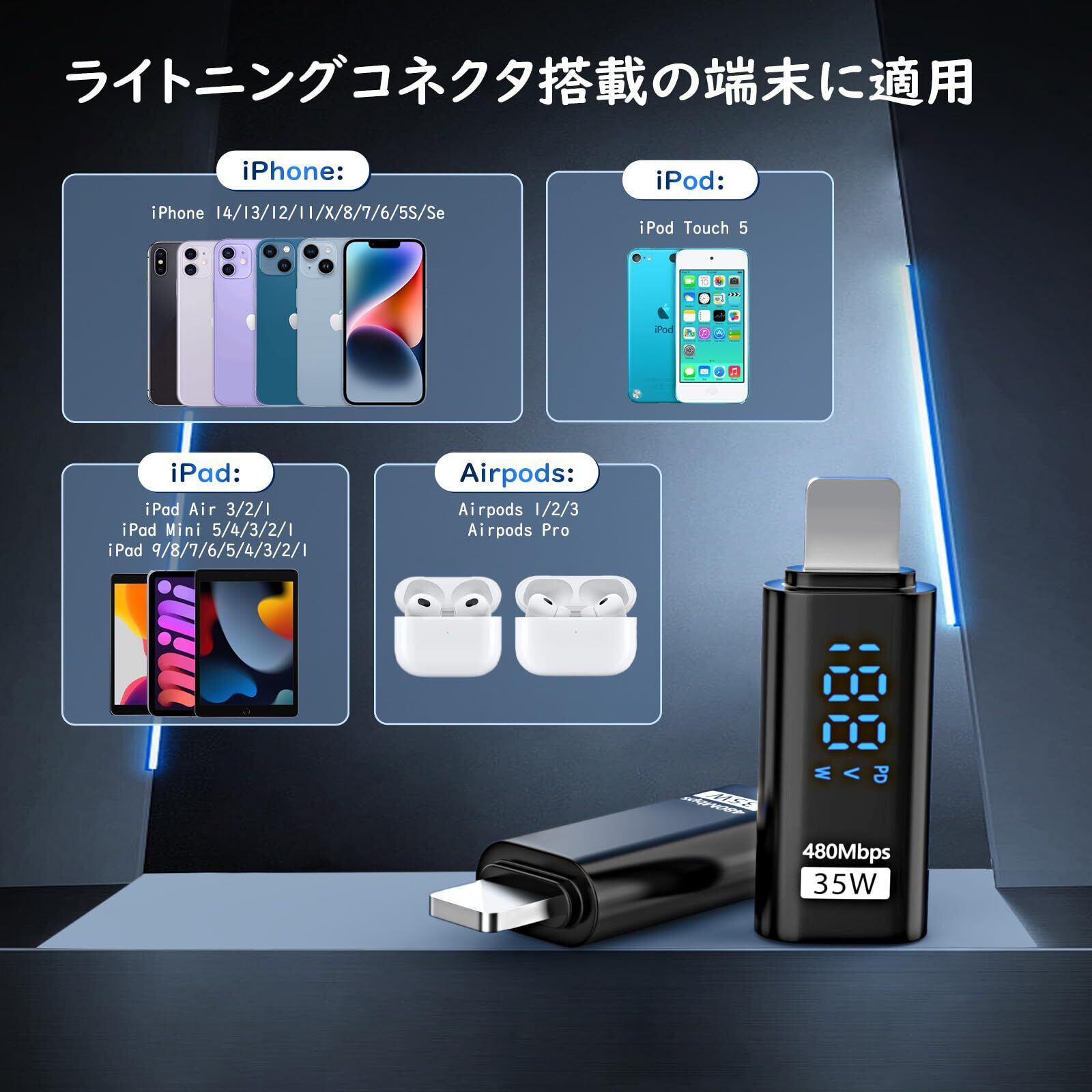 「機種端末を幅広く対応」iPhone 14/13/12/11 Pro Max/iPad/iPod/AirPodsなどライトニングコネクタ搭載のアップル端末に対応端子が異っても繋げるように大活躍してくれます。35W通常スピード(DC20V/1.75A)充電もサポートしており、480Mbpsでデータ転送対応しくれて、様々なスマートライフシーンにご活用いただけます。