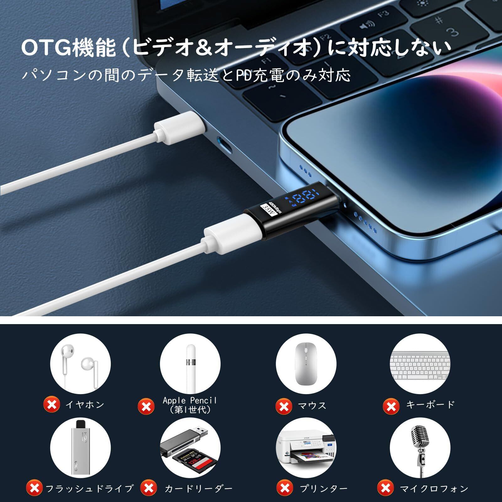 「端子が異っても繋げる」アダプターが1つあるだけで、端子が異っても繋げればスムーズに充電されるようになるUSB-C端子からライトニング端子に変換用の変換アダプタです。※本製品はPD充電やデータ転送をサポートしていますが、OTG機能を対応しませんので、イヤホン/通話/マイク/音楽/ビデオ/メモリスディック/マウスなどにも対応しません。