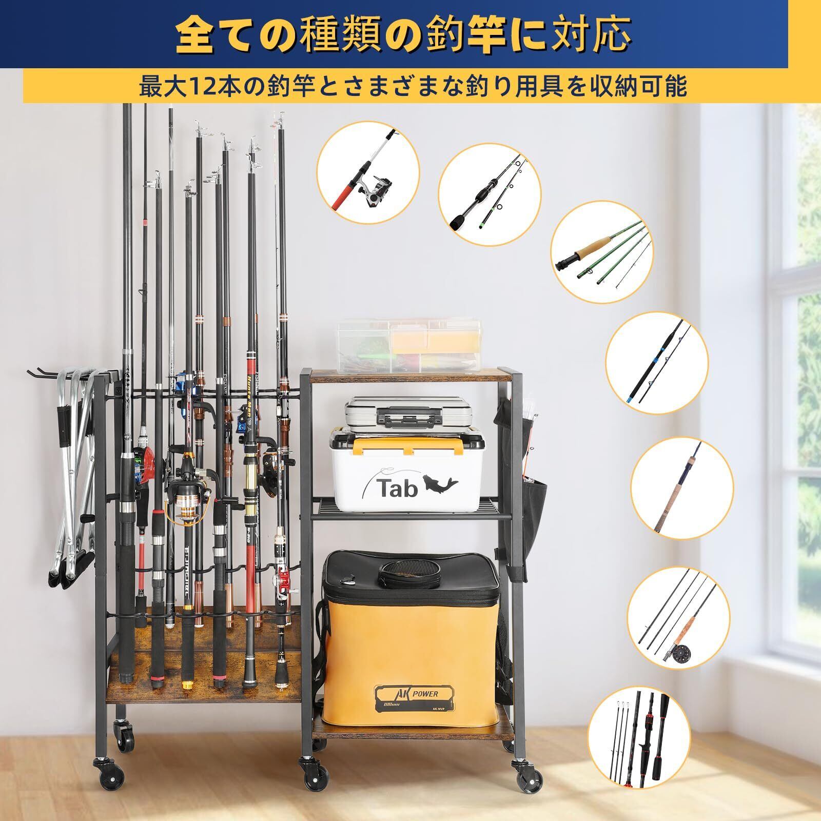 ロッドスタンド 釣り竿立て 大容量の釣り竿立て 釣り竿用の専用ラック 12本の釣り竿が収納できる釣り竿立て キャスター付き 組立式 屋外・室内両用