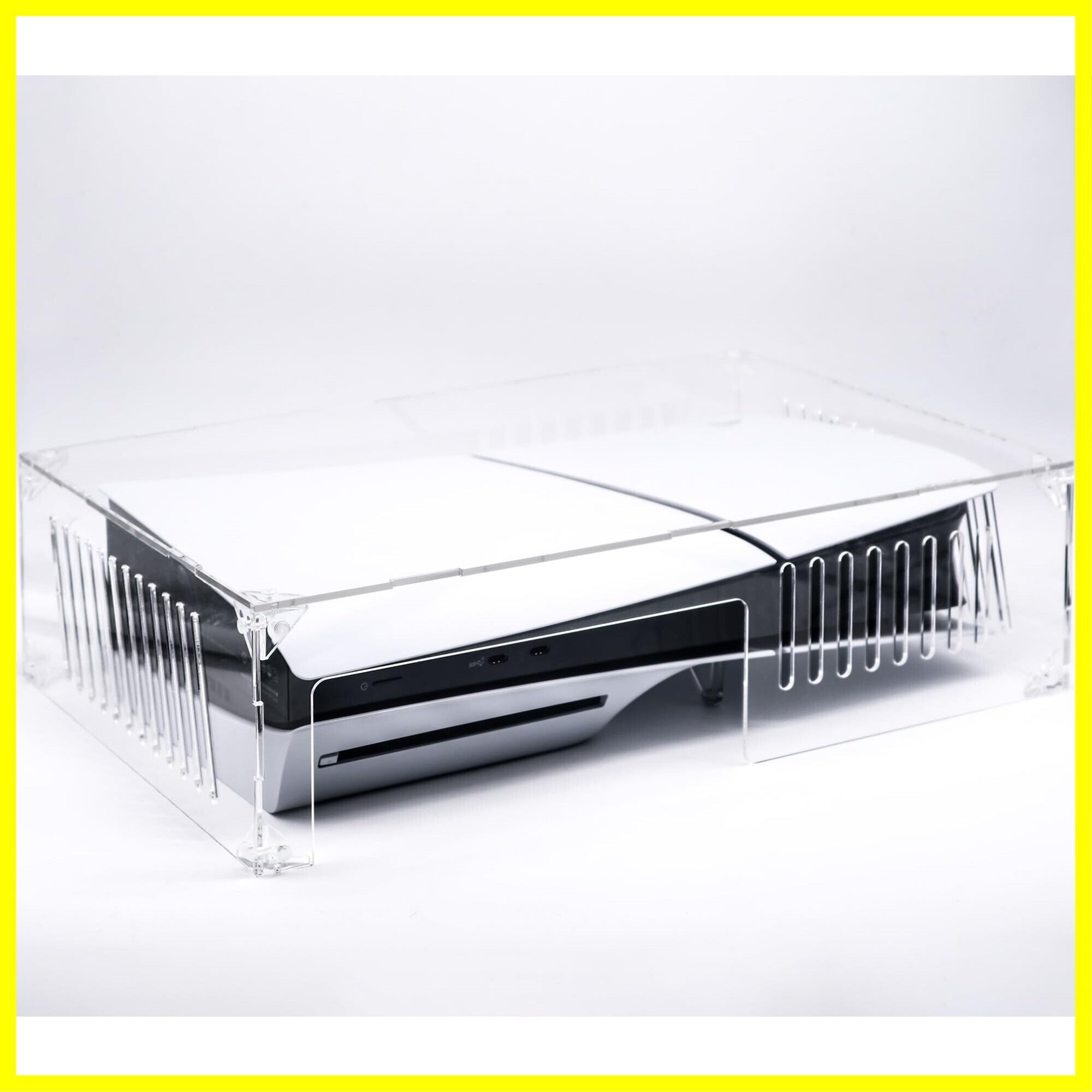 【サイズがピッタリ】アクリルカバー自体大きさには余裕ある為使い勝手は良いです。ディスク用のスリットやUSB端子用の穴もあるので、いちいち外さなくてもよいです。ps5スタンド使用していても特に問題なく使用できます!