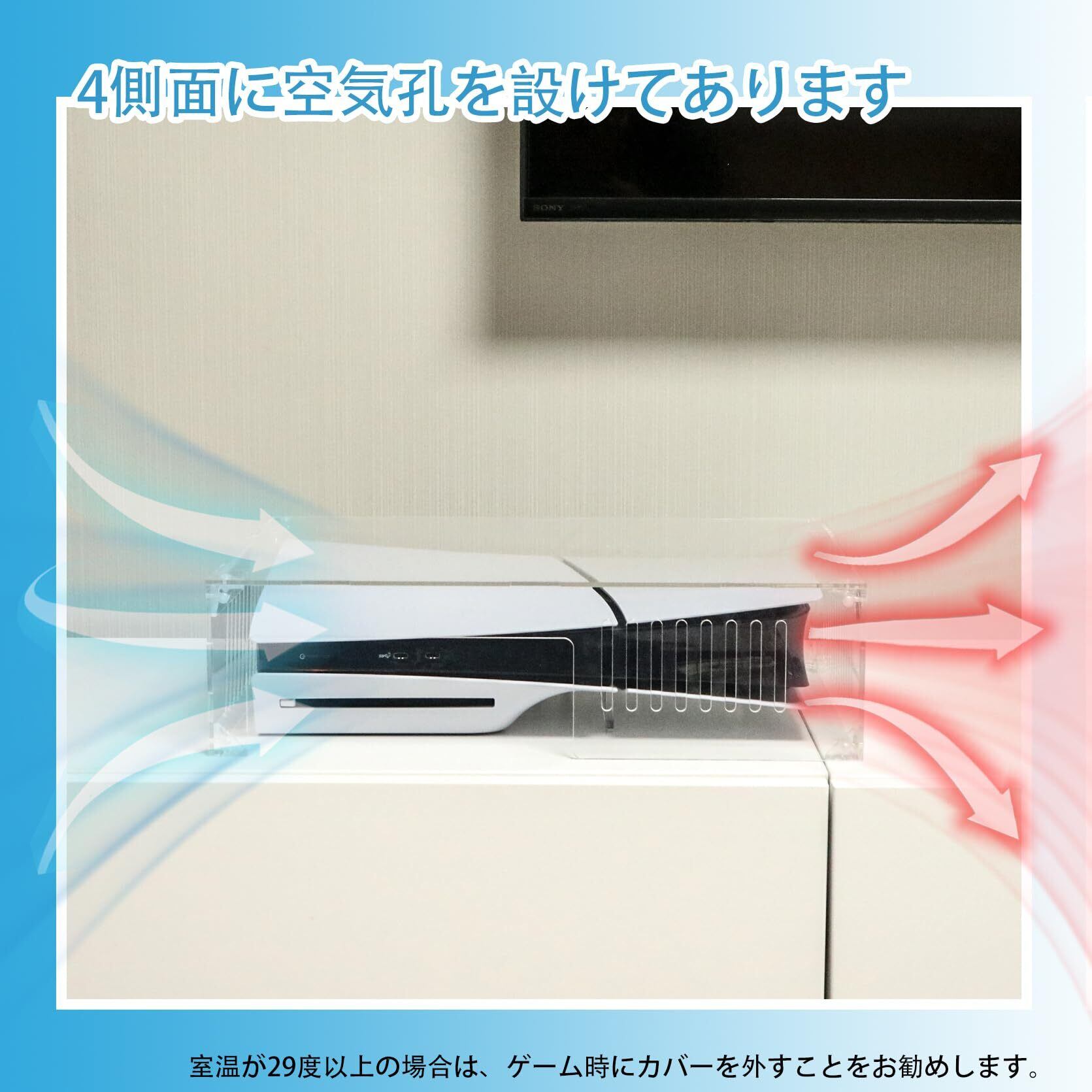 【透明度】透明度が高く高級感あります。透明度の高い厚さ3ミリアクリル板で、PS5をすっぽり被せられます。このカバーをしているPS5を見ると量販店のディスプレイみたいな感じもあります