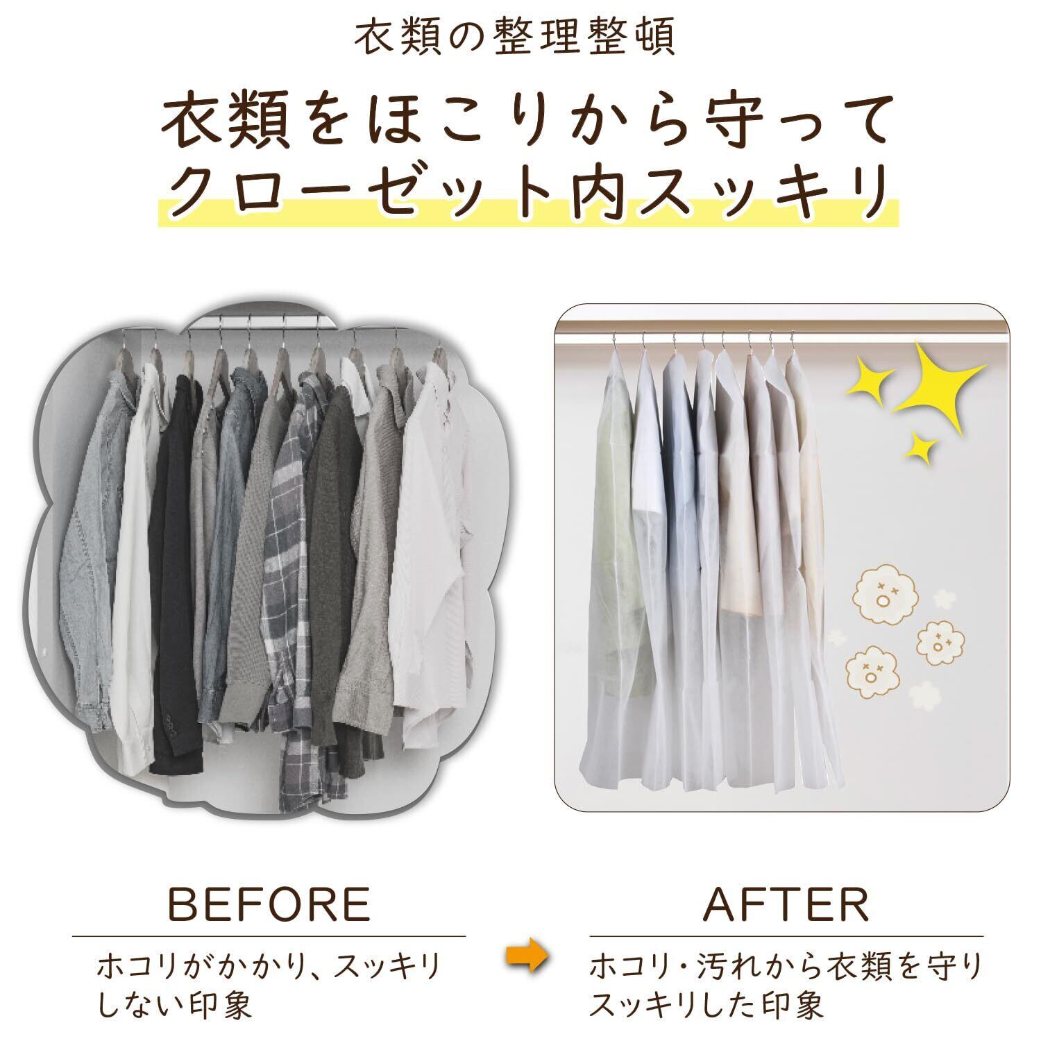 【クローゼットがスッキリ】:カバーを掛けることで、クローゼット内の服をまとめてスッキリ収納。