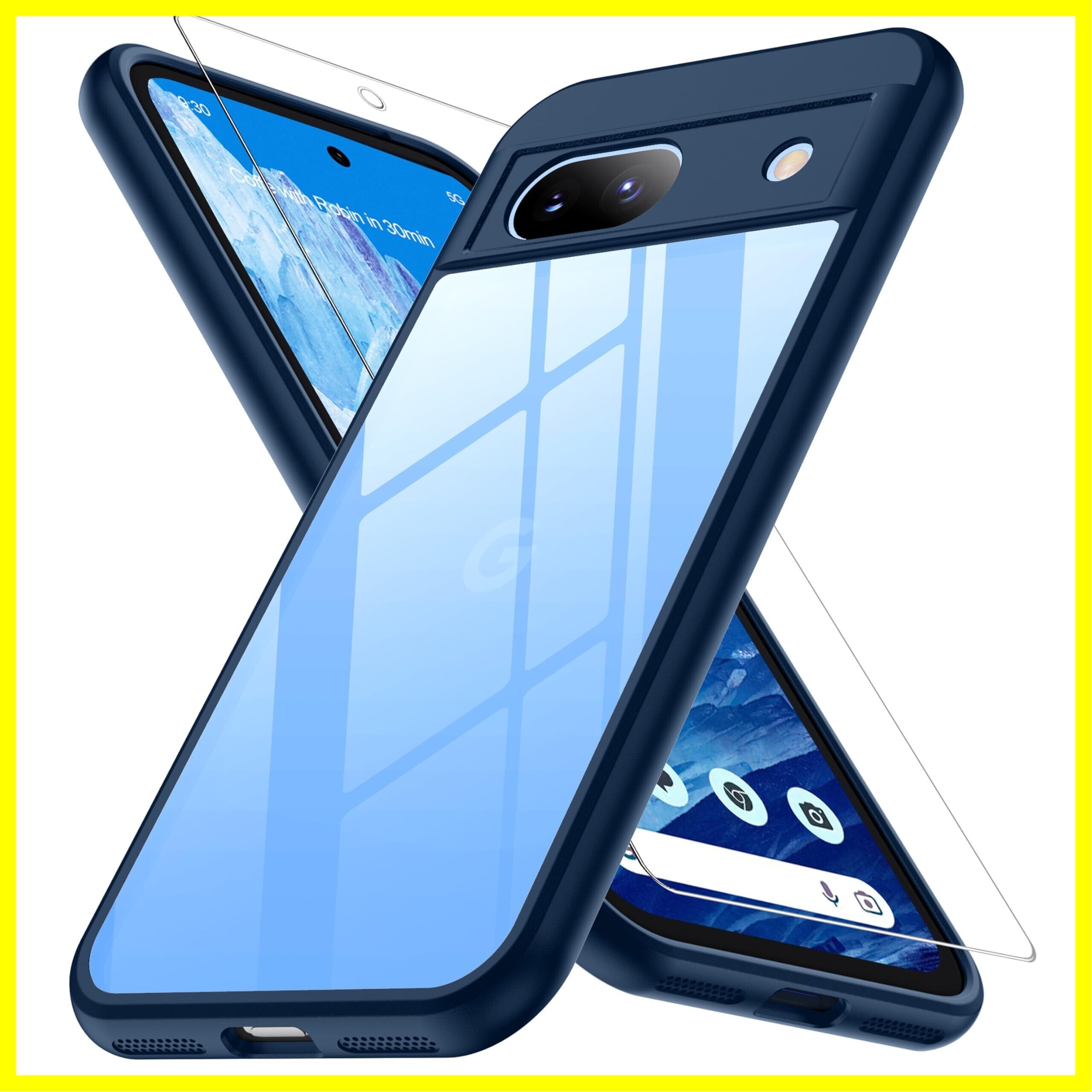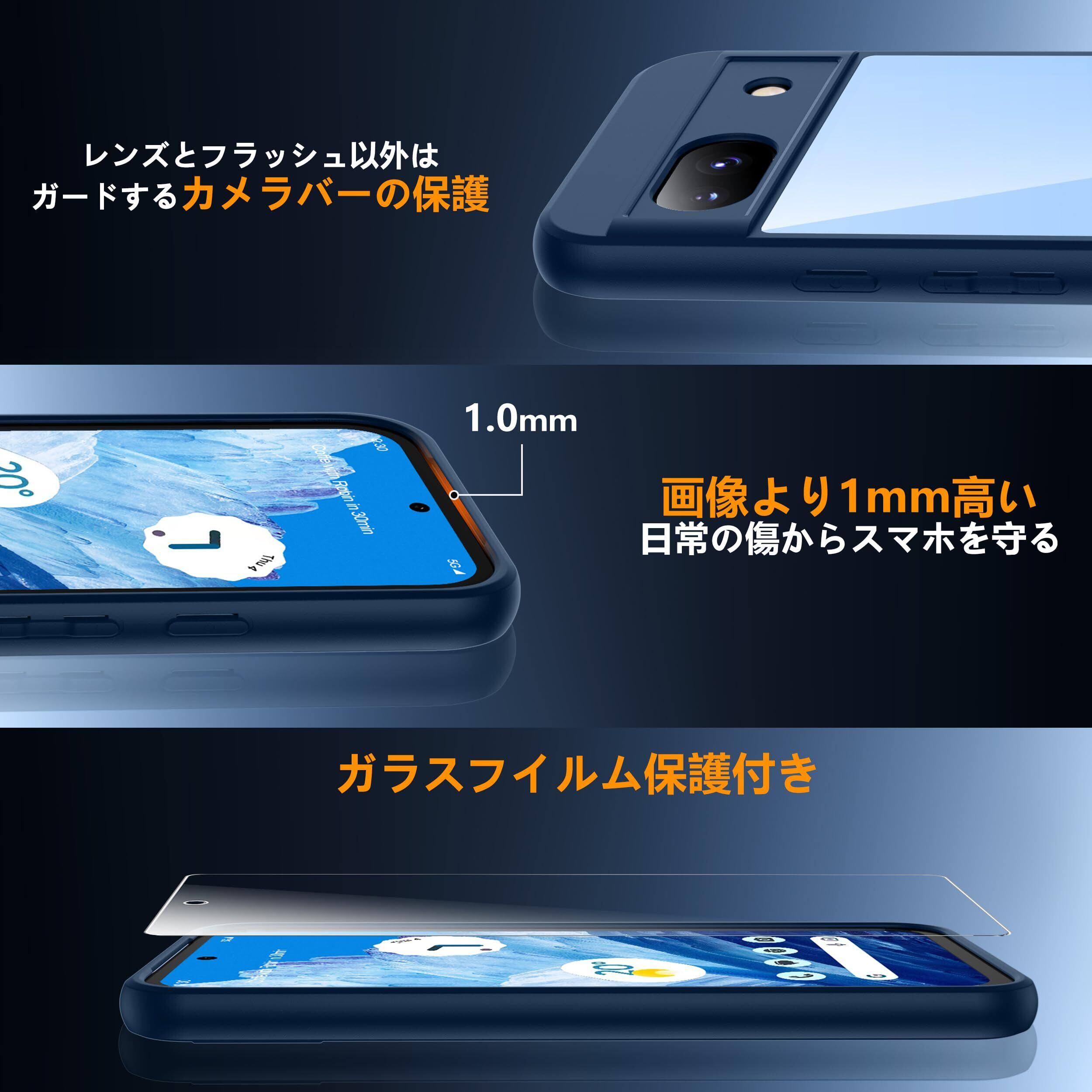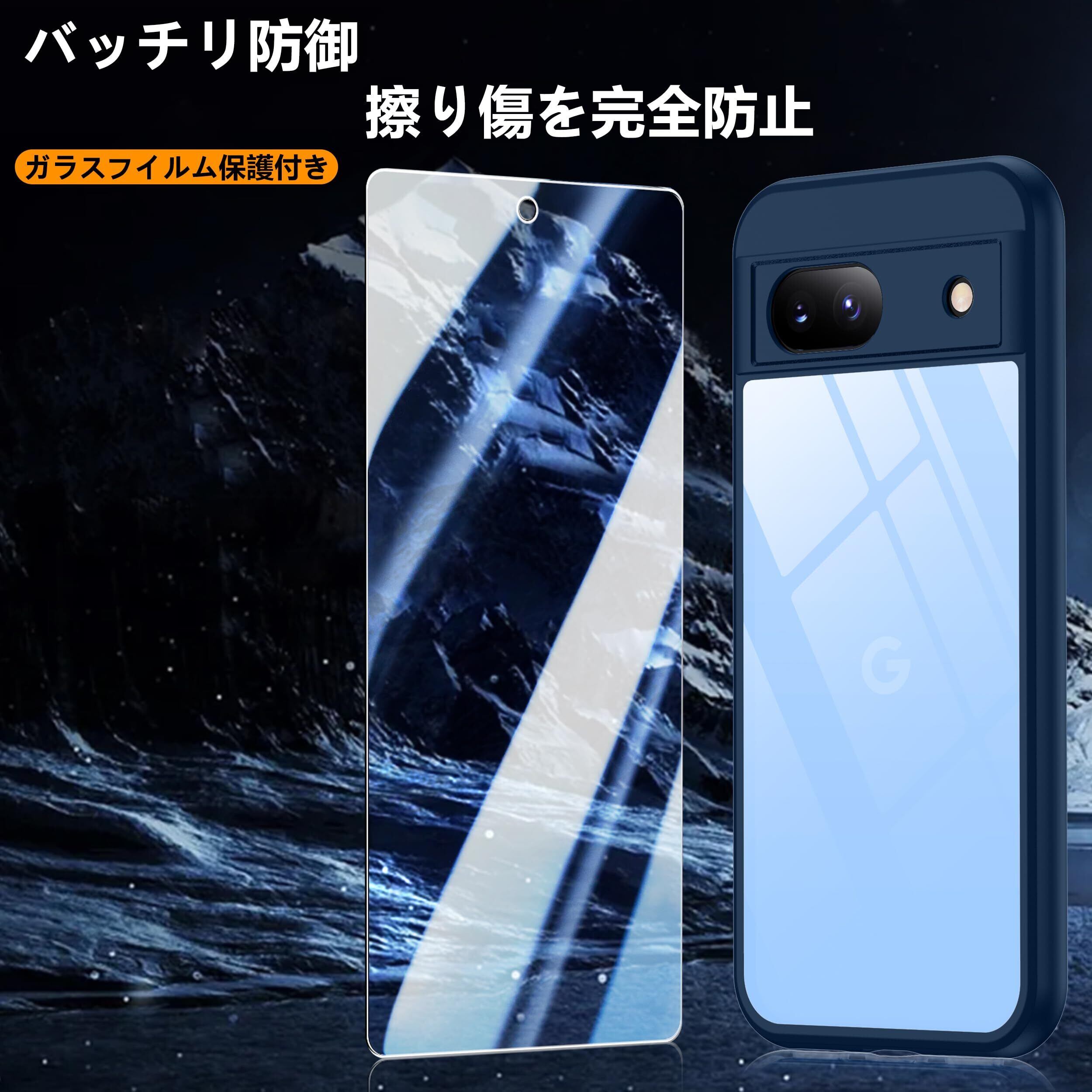 Google Pixel 8a ケース ブルー 黄変防止 グーグルピクセル8a ケース 耐衝撃 ガラスフイルム保護付き 指紋防止 落下防止 耐久性 ストラップホール付 薄型 軽量 ソフトカバー ワイヤレス充電対応 googleピクセル8a
