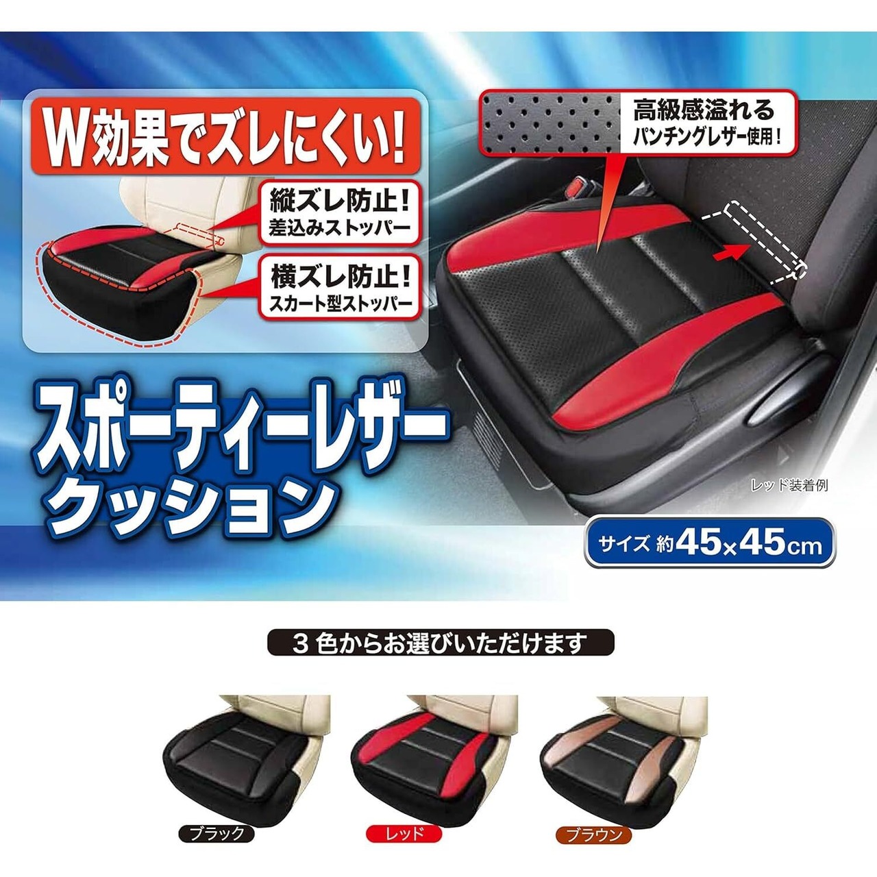 【快適なドライブを実現するシートクッション!】この[ボンフォーム シートクッション レザーアロー]は、軽やかさと高級感を持ち合わせた絶妙なアイテムです。ヒップ型のデザインで、シートにしっかりフィットし、快適な座り心地を提供します。サイズは45x45x2cmと、軽・普通車のシートに最適です。