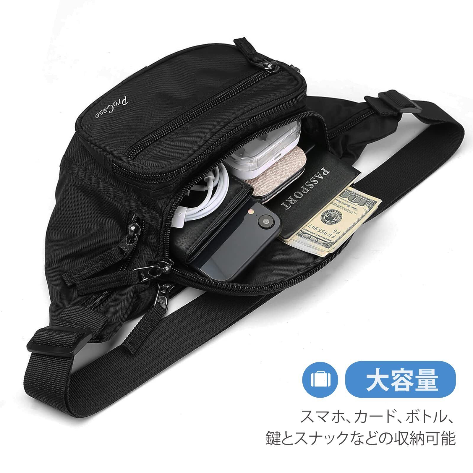 ProCase ウエストポーチ ウエストバッグ 調節可なウエストバンド 6個ポケット メンズ レディース 仕事用 バイク用 耐水性 大容量 ipone/Airpodsなど収納可能 財布 適用場所:旅行 ハイキング ランニング アウトドア- ブラック