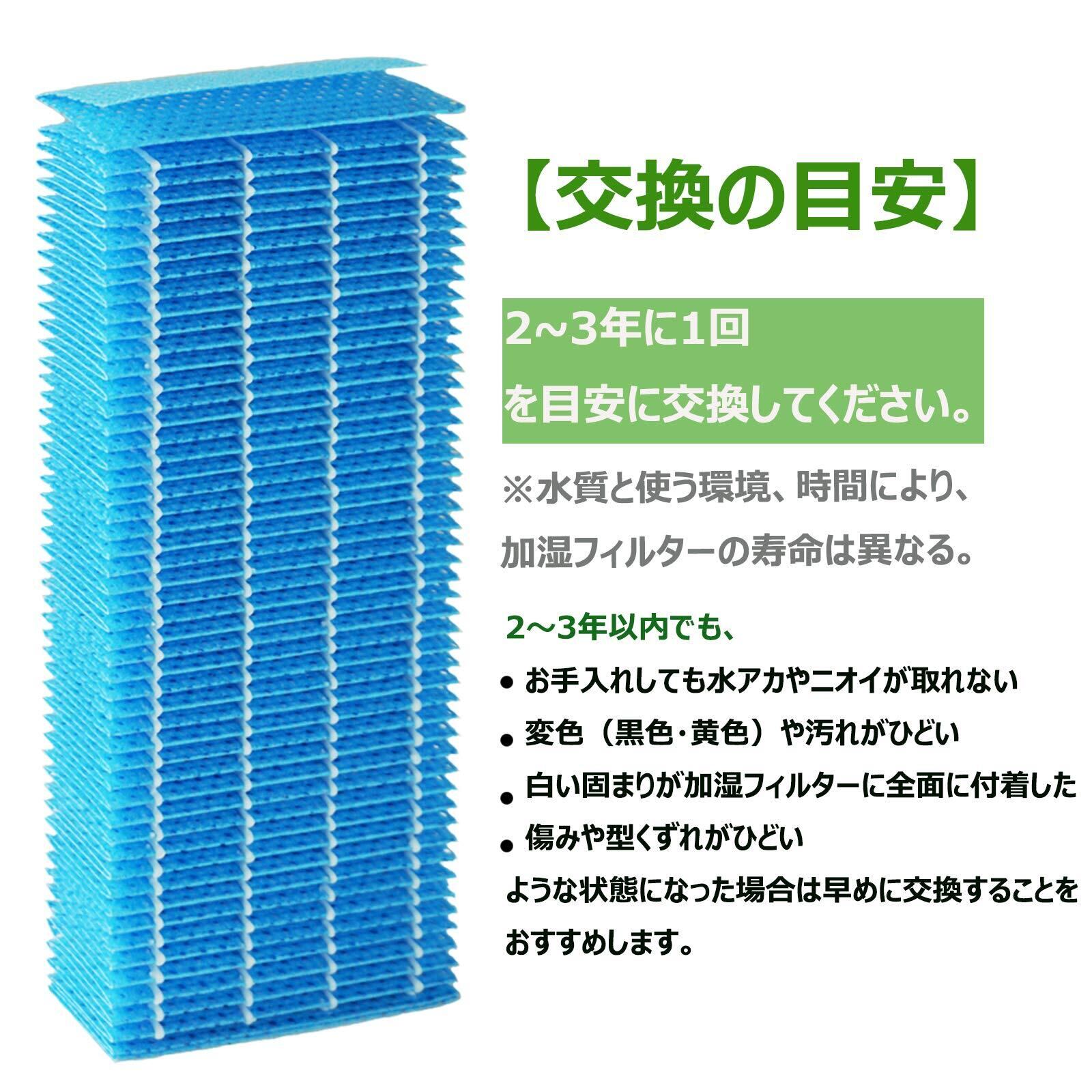 【交換の目安】2~3年に1回を目安に交換しましょう。お手入れしても、加湿しない場合は早速フィルターを交換してください。※ご使用の時間と環境により、フィルターの寿命が異なります。