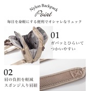 ファスナーポケットがたっぷりついた軽量リュックサック。 ハンドルや引手は牛革を使って、耐久性を高くしています。 撥水加工ナイロン製なので、急な小雨の時などにも安全です。