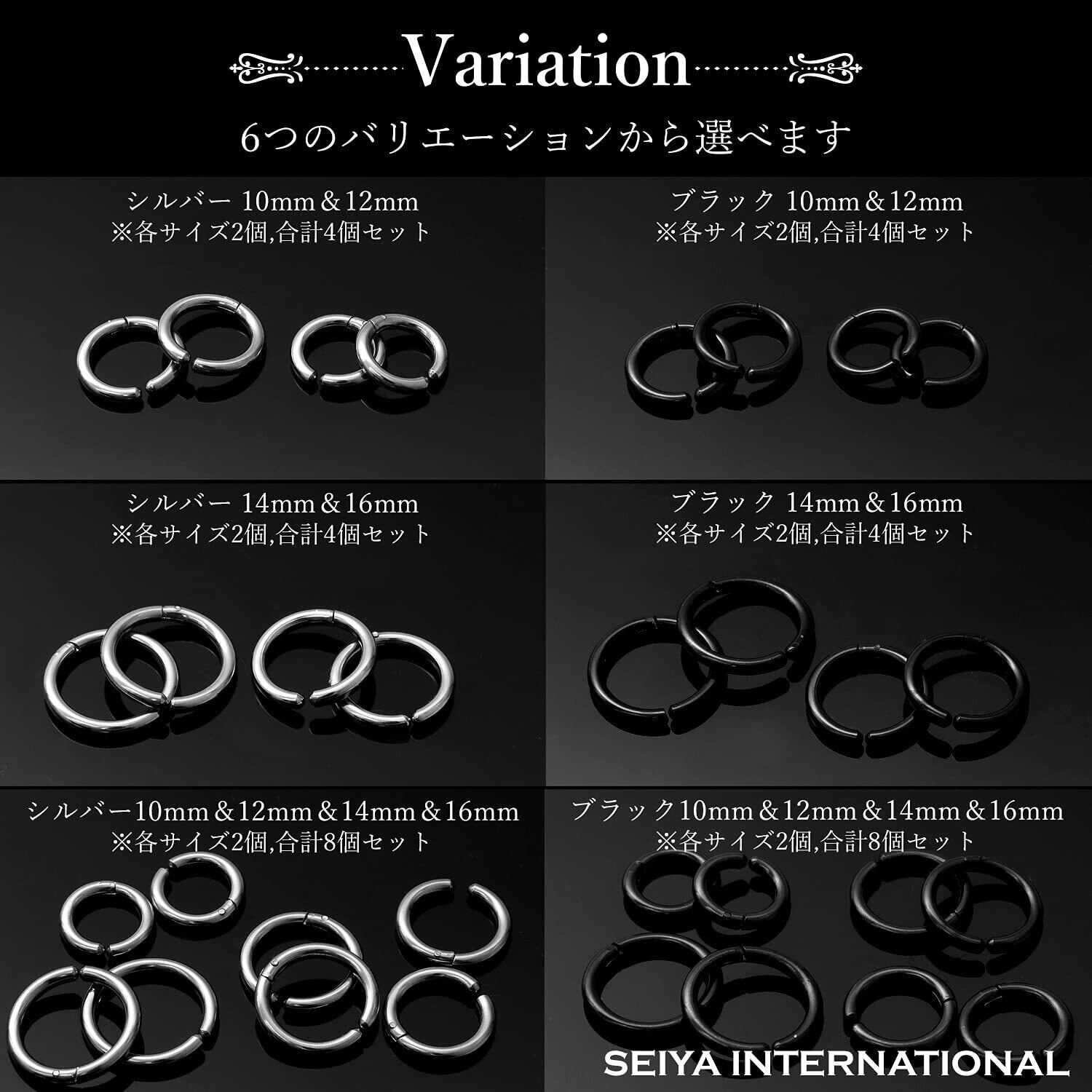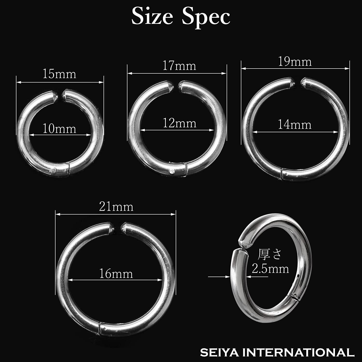 【 選べるカラー・サイズ 】フープイヤリングのサイズは内径10mm・12mm (外径15mm・17mm)のセット 内径 14mm・16mm (外径19mm・21mm)のセットと内径10mm・12mm・14mm・16mm (外径 15mm・17mm・19mm・21mm)のフルセット、カラーはシルバー・ブラックの2色をご用意しました。フープイヤリングの厚さは約2.5mmになります。フープのサイズはわっかの直径が大きいほど存在感があり、カジュアルな印象を与えます。シンプルなコーディネートに華やかな雰囲気を加えたい時は、直径の大きなフェイクピアスがおすすめです。一方、わっかの直径が小さいほど上品で落ち着いた印象になります。シックにまとめたい時やビジネススタイルに合わせる時には直径が小さなフェイクピアスがおすすめです。ブラックのフェイクピアスはクールな雰囲気に仕上がります。シルバーのフェイクピアスは、洗練された落ち着きのある印象に仕上げたい時におすすめ。シルバーの輝きはコーディネートをすっきりと魅せてくれます。