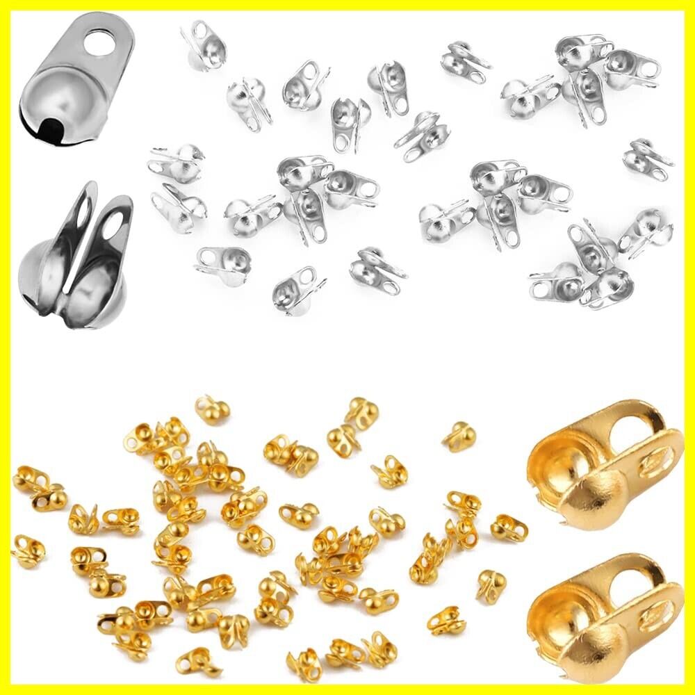 [ボールチップ カシメ玉 400個セット] 304 ステンレス エンドパーツ 留め具 基礎金具 ビーズ ボールチップ つぶし玉 アクセサリーパーツ 手芸用品 手作りアクセサリー DIY用 ブレスレット ネックレス用 ゴールド/シルバー各200個 (2.4mm側面開口部)