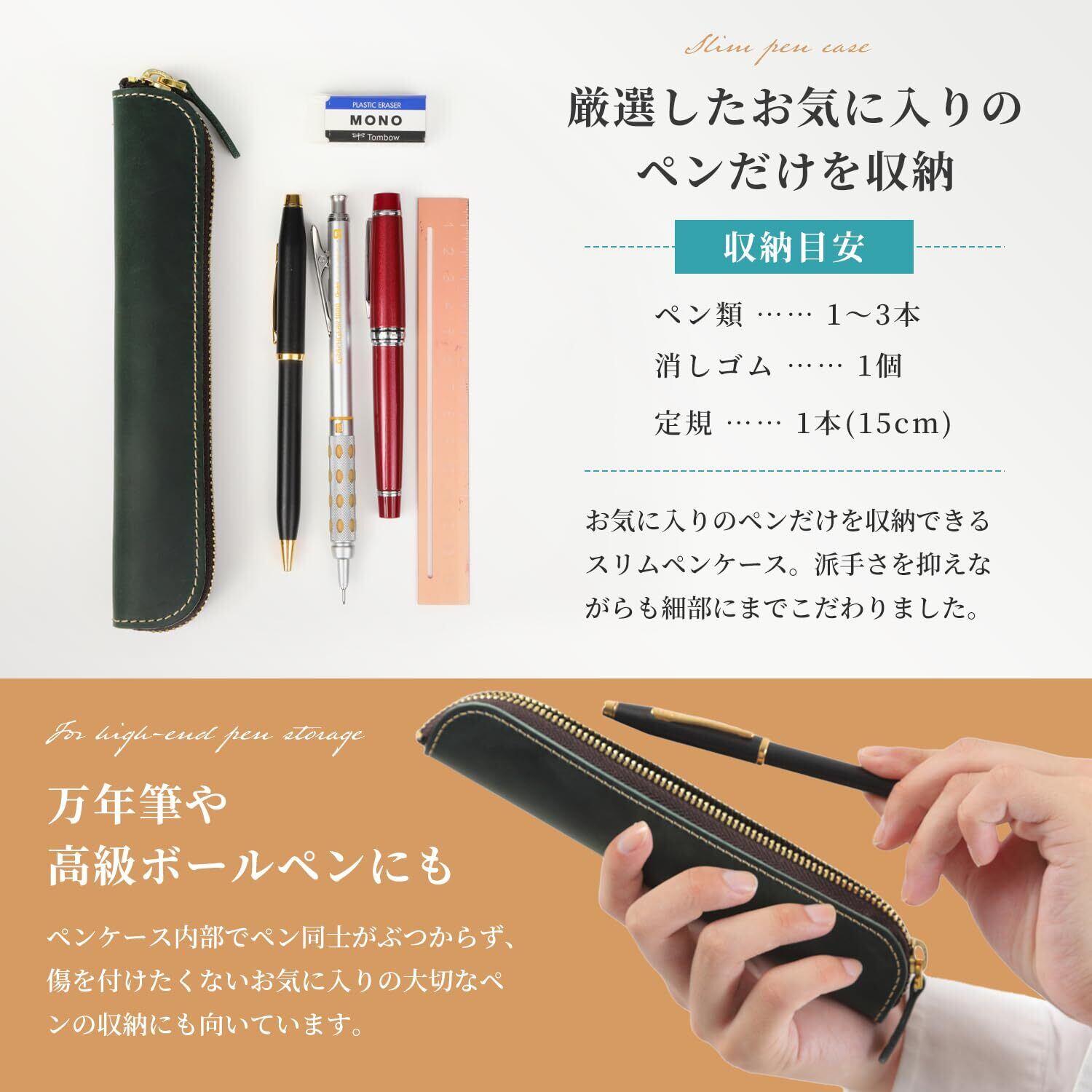 "【厳選したお気に入りの文房具を収納】収納の目安:ペン1~3本、消しゴム1個、定規1本(15cm) 【お知らせ】本製品には高品質な本革クレイジーホースレザーを使用しています。初めは硬く感じられるかもしれませんが、使うほどに手に馴染み、柔らかくなります。長く愛用いただける素材ですので、ぜひお楽しみください。"