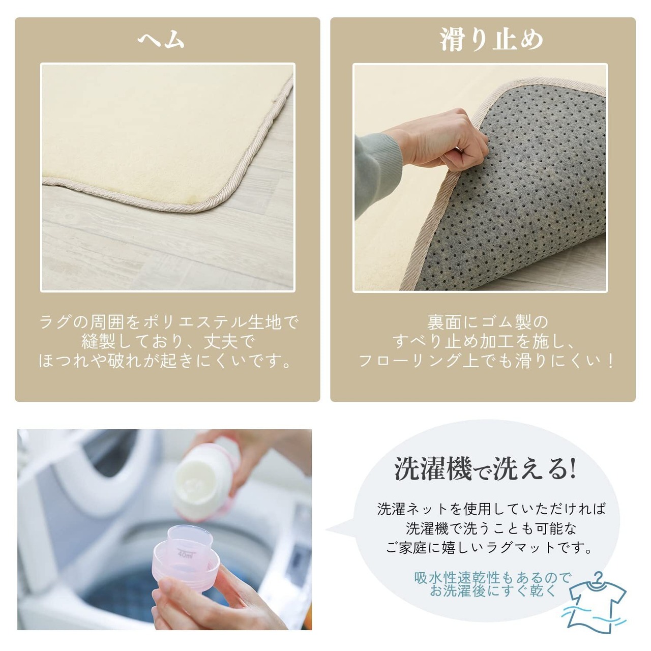 【滑り止め付で安心!】このラグには滑り止め加工が施されており、ズレにくく安全に使用できます。ペットや小さなお子様がいるご家庭でも安心してお使いいただけます。しっかりした作りで、日常使いに最適です。