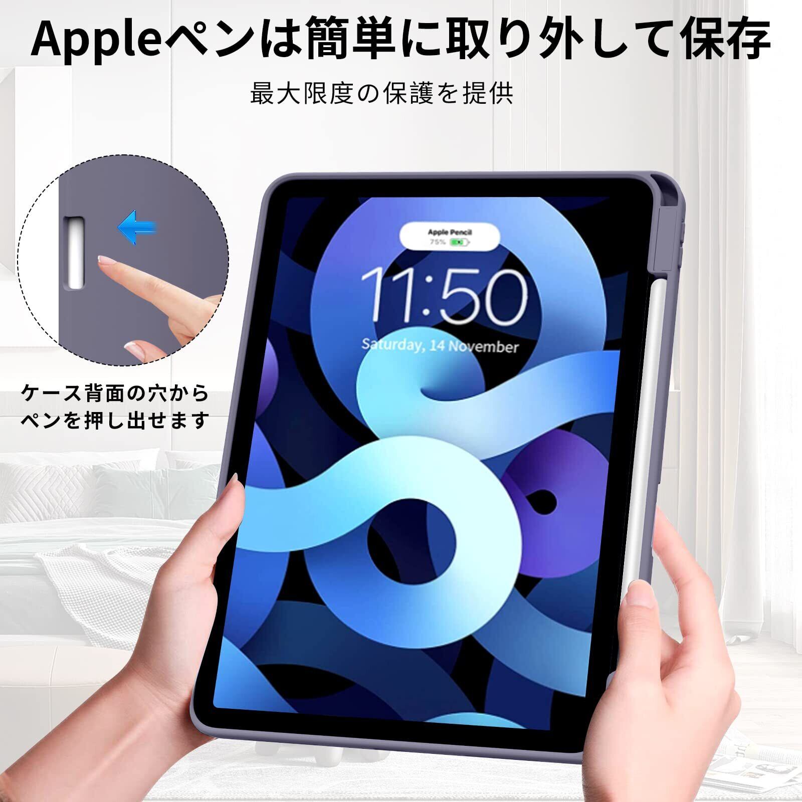 【ペンホルダー付き】内蔵のiPadペンシルホルダー、便利にあなたの鉛筆を配置し、取り外し、あなたが歩いているか、または屋外にいるときにあなたのApple Pencilを失うか、または壊すことを防ぎます。アップルぺんシルのペアリングとワイヤレス充電に対応できて。