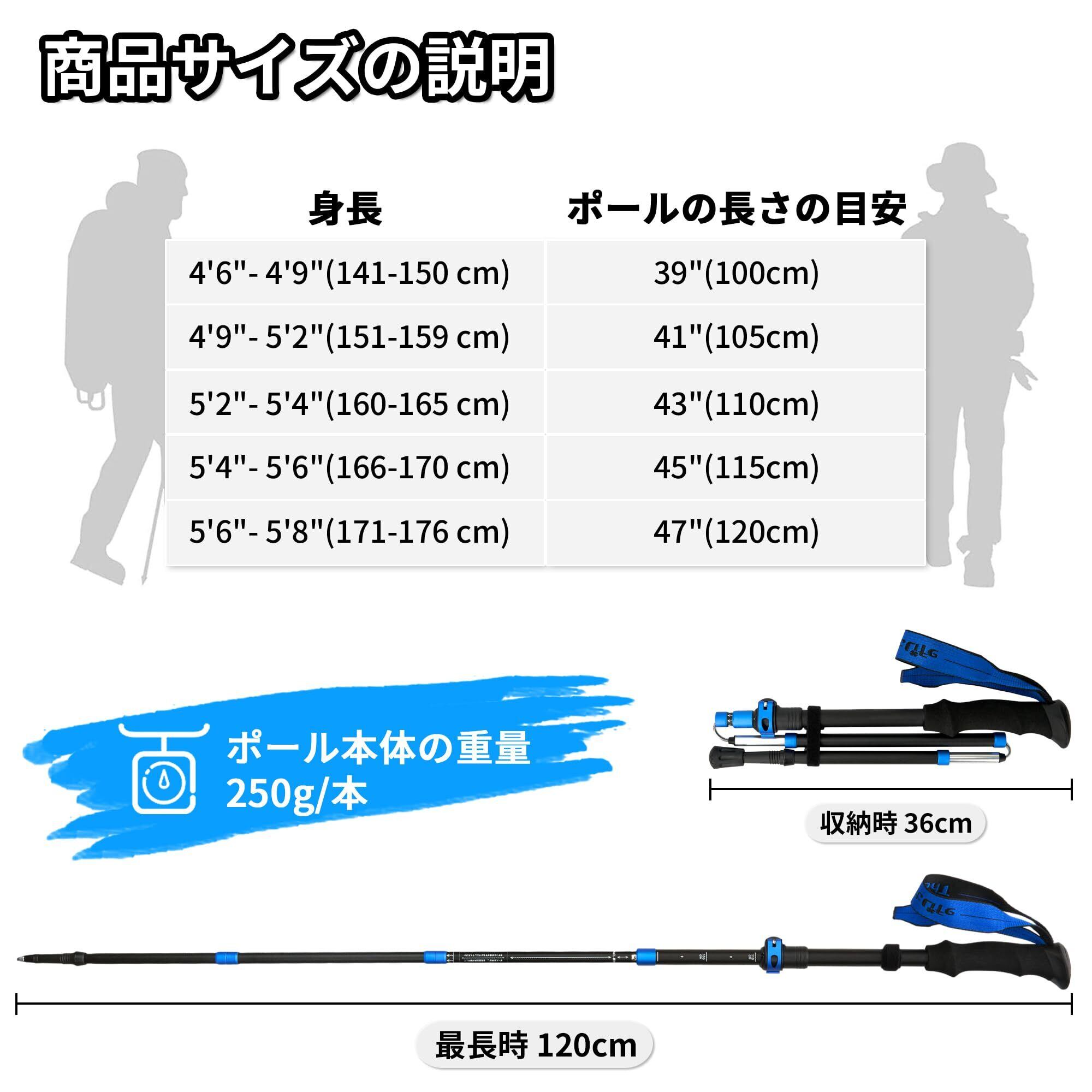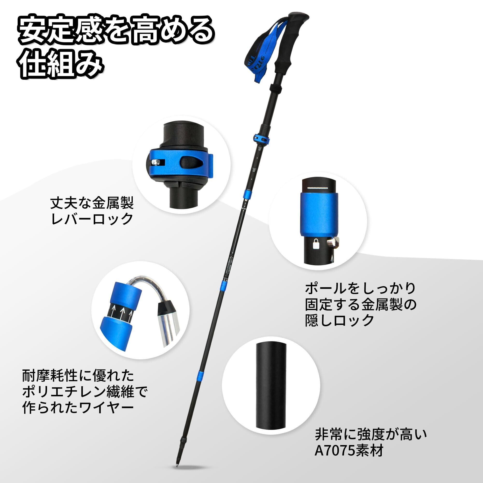 【汎用性が高い】使用者身長対象範囲:141-176cm。ポールの先端はタングステン鋼製で高いグリップ力を発揮することができます。トレッキングキャップ、バスケット、スノーバスケットが付属していますので、あらゆる天候や地形にも対応できます。金属製の隠しロックは小さな力でも素早く動作しますので、ポールの安定感を確保します。【ご注意】(1)本商品は登山向けに使用するトレッキングポールです。スキー用ではありませんのでご注意ください。(2)力を入れますとポールが縮む場合、ロックのネジを回転させてロックの強度を調整してください。