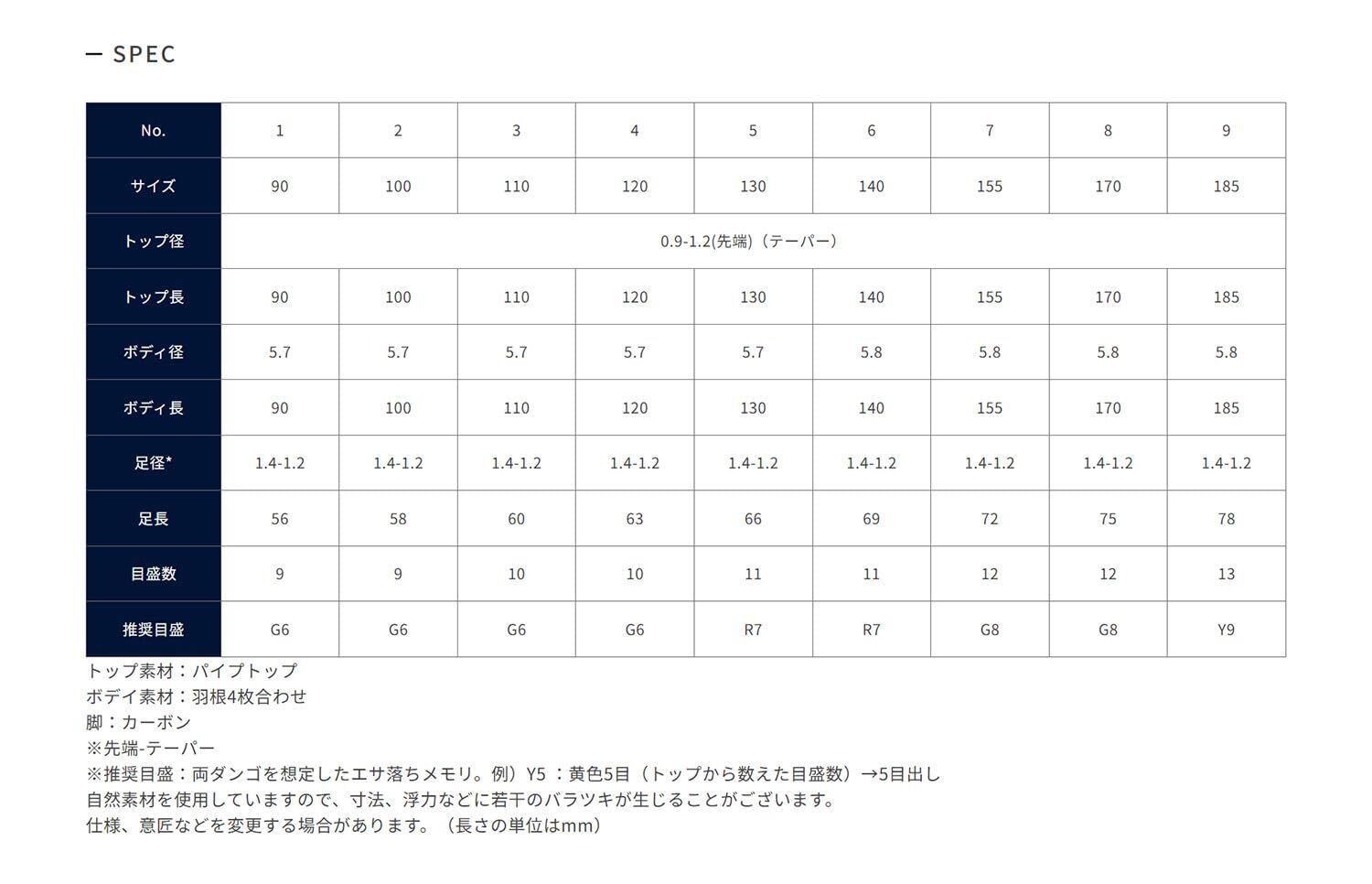 ※推奨目盛:両ダンゴを想定したエサ落ちメモリ。<br>例)Y5 :黄色5目(トップから数えた目盛数)→5目出し自然素材を使用していますので、寸法、浮力などに若干のバラツキが生じることがございます。<br>仕様、意匠などを変更する場合があります。<br>(長さの単位はmm)