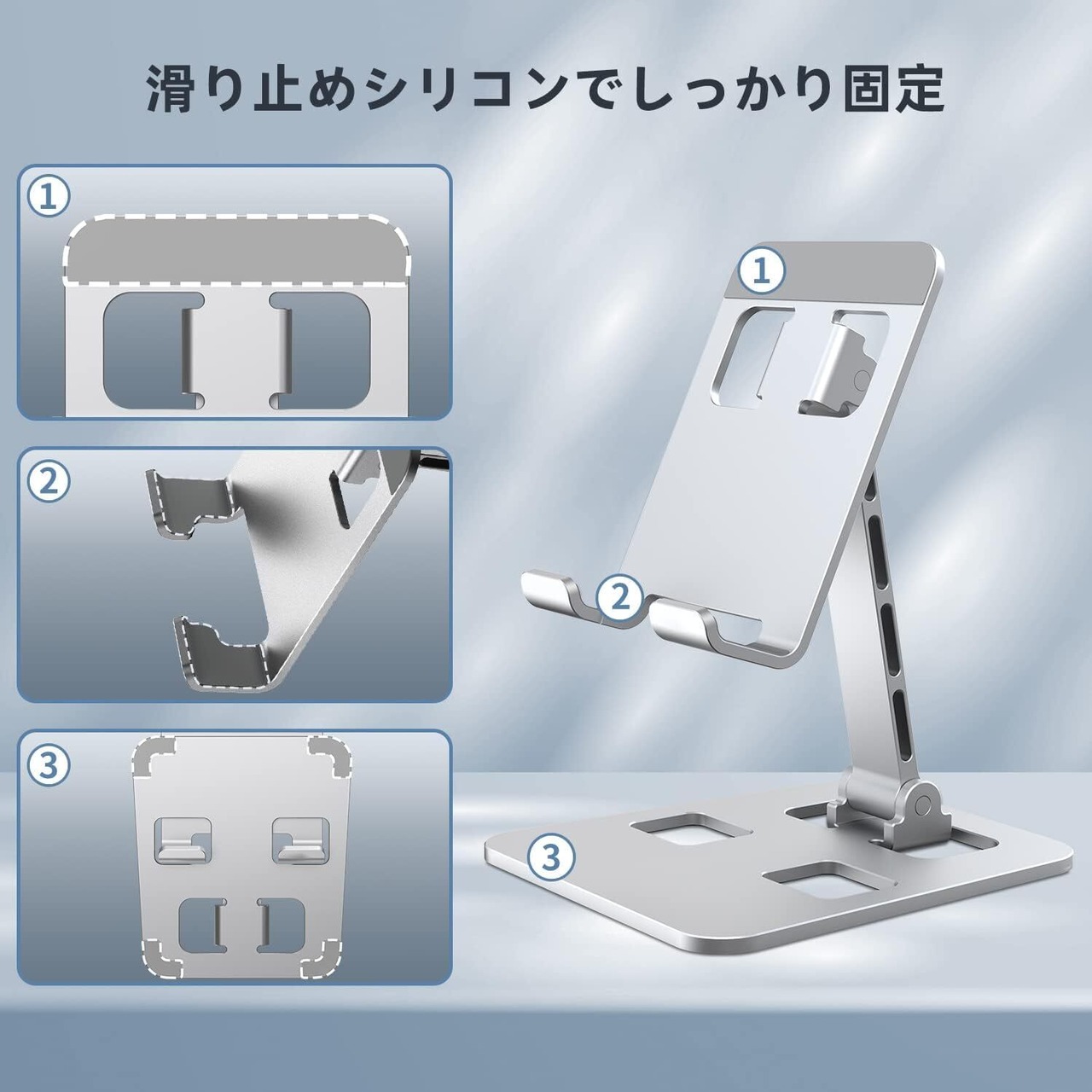 【滑り止めシリコンでしっかり固定】スマホスタンドの携帯に接触する場所には、デバイスをしっかり固定し、傷から保護できるやさしいシリコンマット付きでスマホがあやまって落下したり、スマホスタンドが転倒を防止します。また、タッチスクリーンの操作の安定性を確保ために本体底面もシリコン製のすべり止めパッドが付いていますので、いっぱいの安心感を与えます。爪の裏にもシリコンが付き、スマホの端末をちゃんと保護できて滑り止められます。