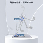 【二つ角度を自由に調整可能】スマホスタンドは可変できる箇所2箇所があり、スタンドバーが180°調節でき、スマホホルダーが270°調節できます。iPadの高さでも、角度も自由に調整ができ、自分のお好みの任意の角度や高さを保持できるフリーストップ仕様であります。両手を解放して、デバイスは縦置き、横置きどちらでもよく、動画視聴や読書などには大活躍です。