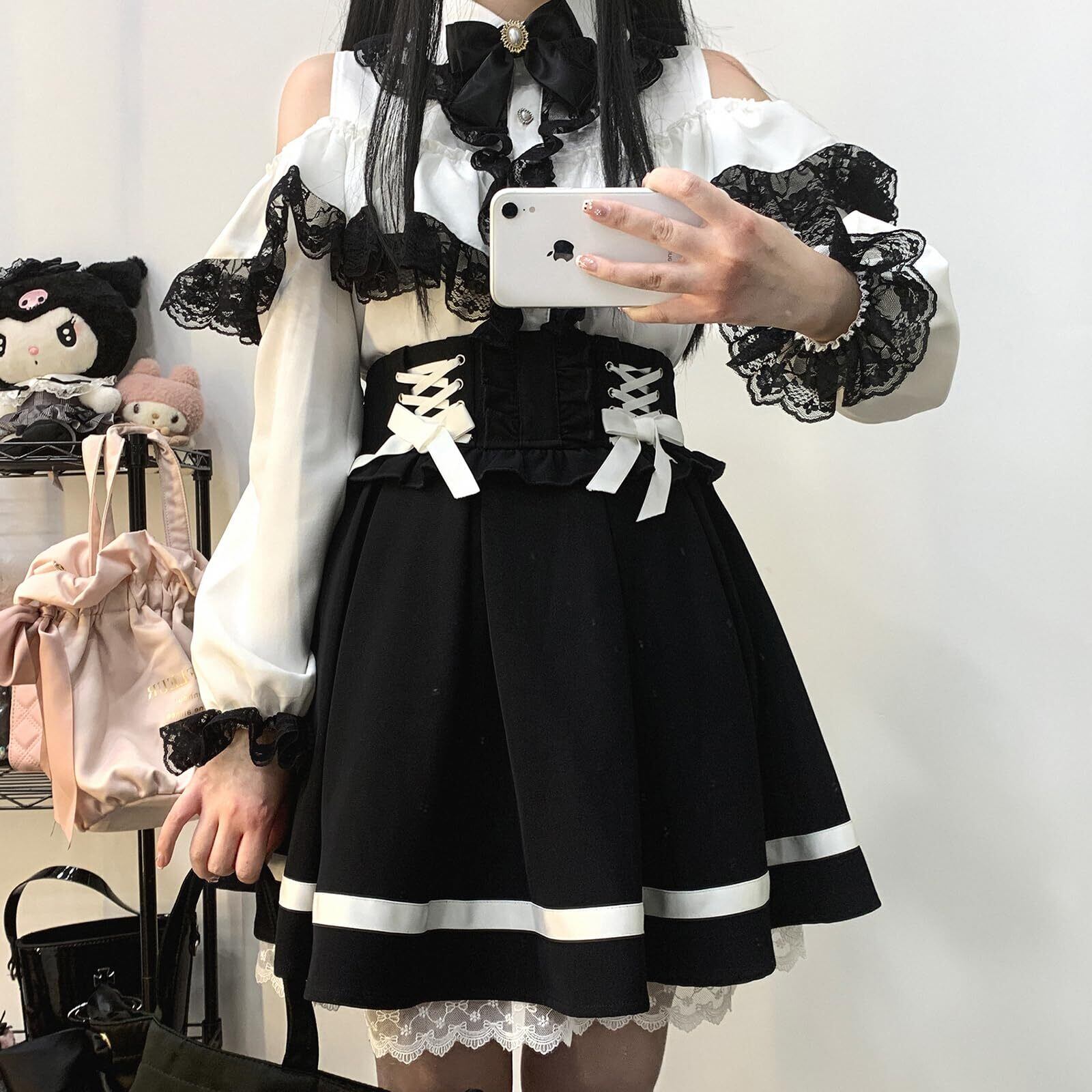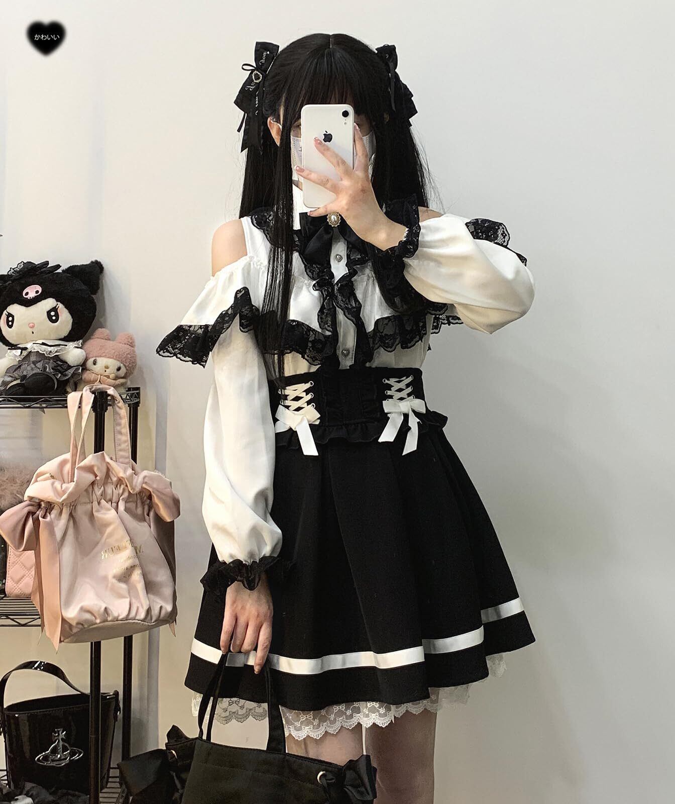 [XHSUKADO] かわいい オープンショルダー ブラウス 量産型 シャツ レディース 2層 レース フリル 取り外し可能 リボン パール 長袖 レディースブラウス おしゃれ 肩出し 地雷系 ファッション フレンチガーリー 学生 春 夏 秋