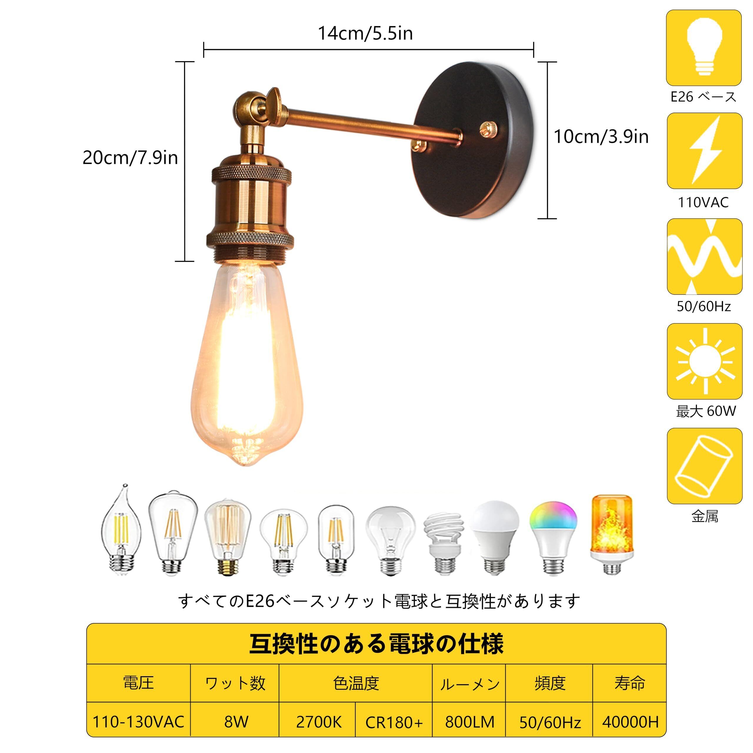 【材質】金属+真鍮+電気メッキ-- ブラケットライトは鉄の素材を採用し、表面はラッカーと電気メッキの加工で、錆びなくて、頑丈になり、長くご愛用頂けます。内部はセラミックランプホルダーで作られています。これは耐火性で耐温性があり、安全に使用できます。