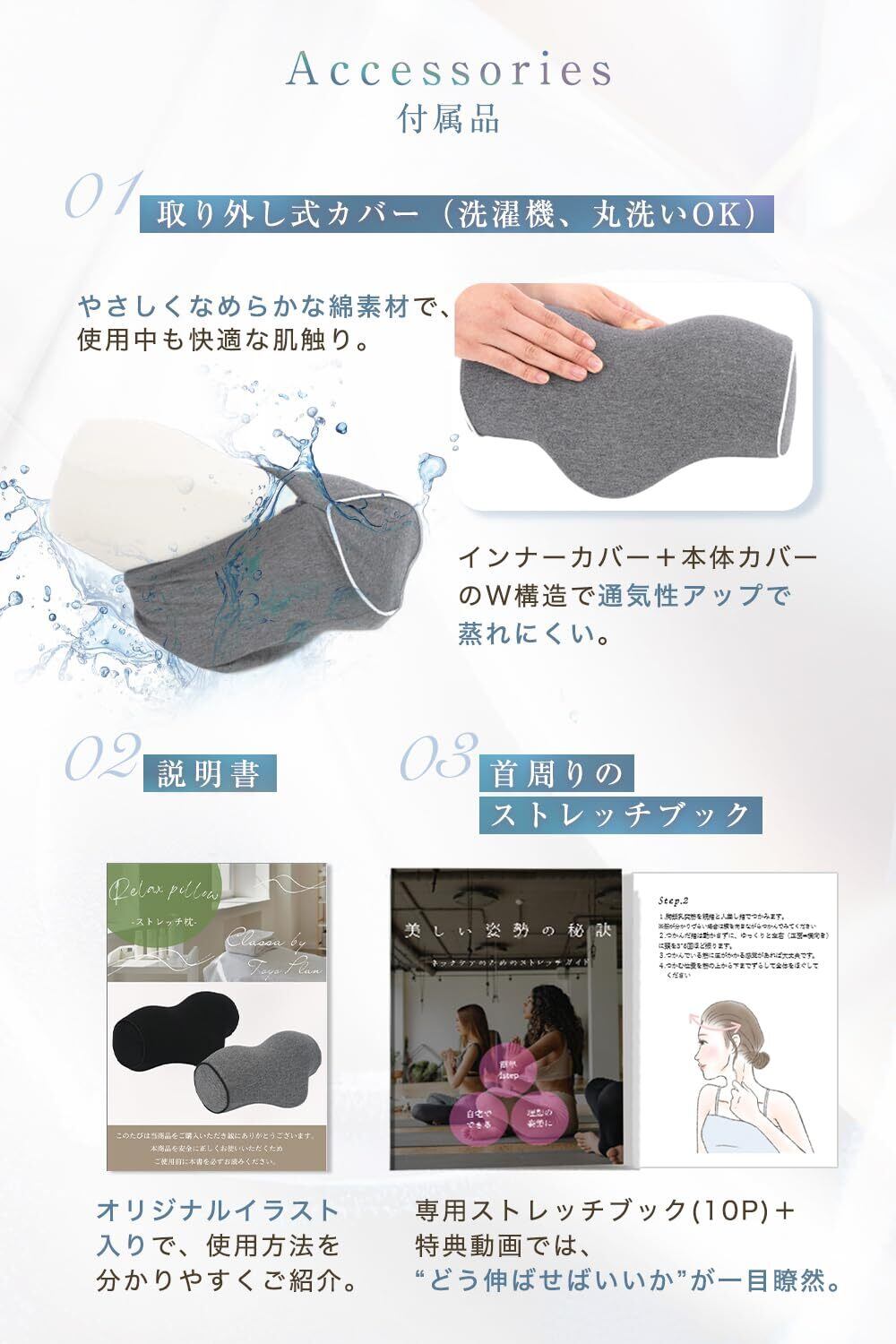 肌ざわりにこだわった首枕カバーは、取り外して簡単に洗えるので、いつでも清潔をキープ。だからこそ、毎日のリラックスタイムをより快適にお過ごしいただけます。清潔さと心地よさを両立し、心も体もリフレッシュできる贅沢なひとときをサポートします。
