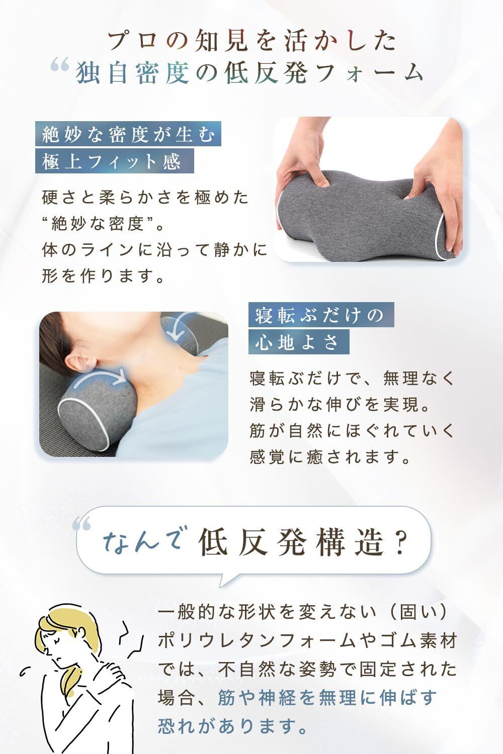 当社が誇る独自の密度を持つ低反発形状記憶フォームを採用したストレッチ枕は、日本人の体型にぴったりフィットするように設計されています。まるでオーダーメイドのように、あなたの体に優しく寄り添い、心地よい伸ばし心地を実現。毎日の疲れを癒し、リラックスしたひとときをお届けします。自宅で簡単にプロのケアを体感できる贅沢を、ぜひご体験ください。