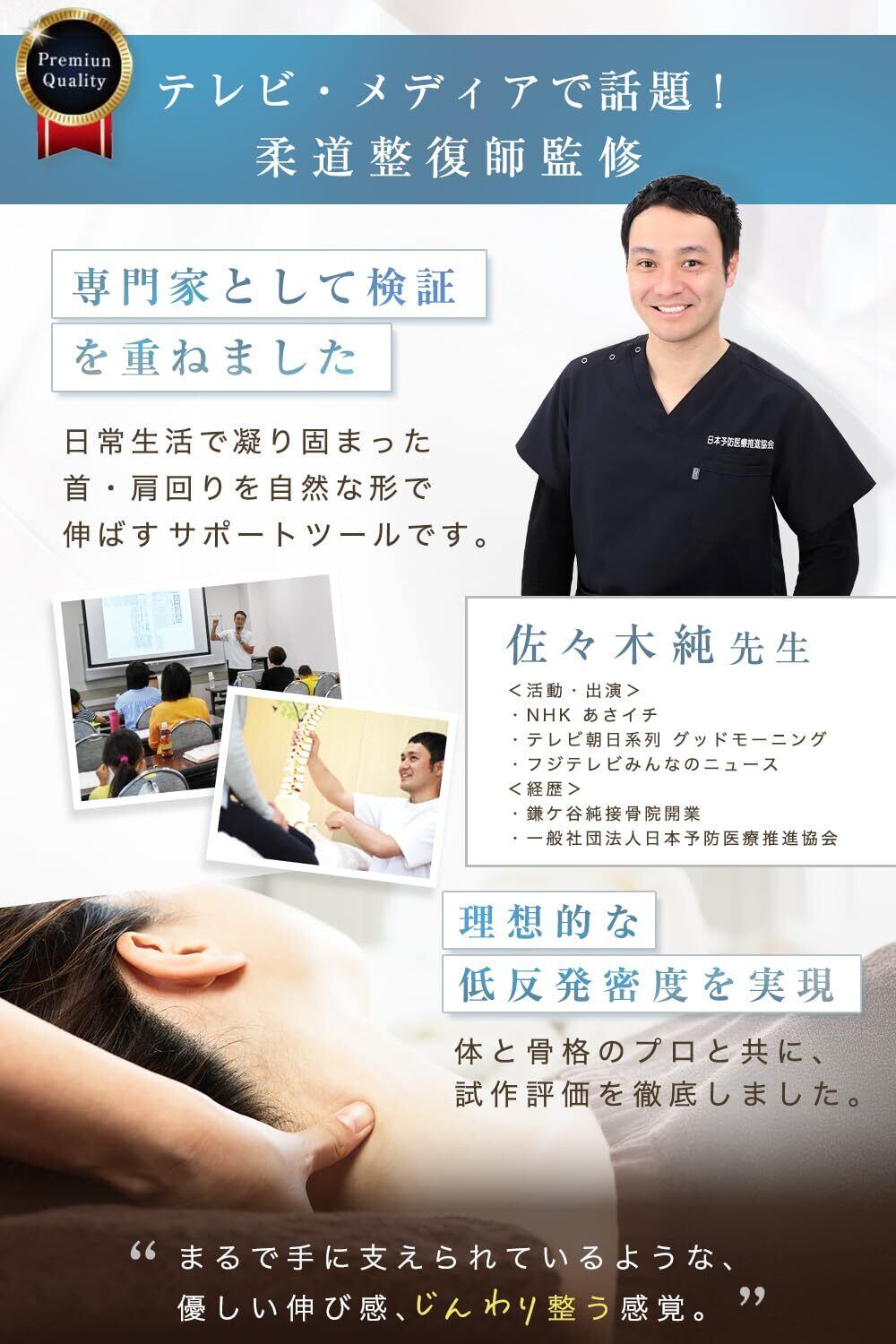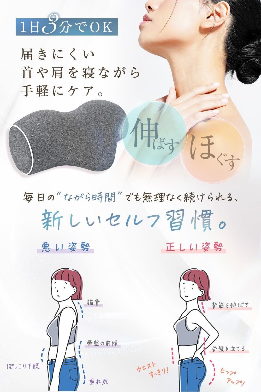【メディアで話題 柔道整復師監修】特別設計のストレッチ枕は、肩から首を優しく包み込むかのような感覚を実現。首のカーブ、そして前側の胸鎖乳突筋にも的確にアプローチし、心地よいリラクゼーションを提供します。毎日の疲れを和らげ、あなたの美しい姿勢をサポートするために、専門家の知恵を詰め込んだ一品です。