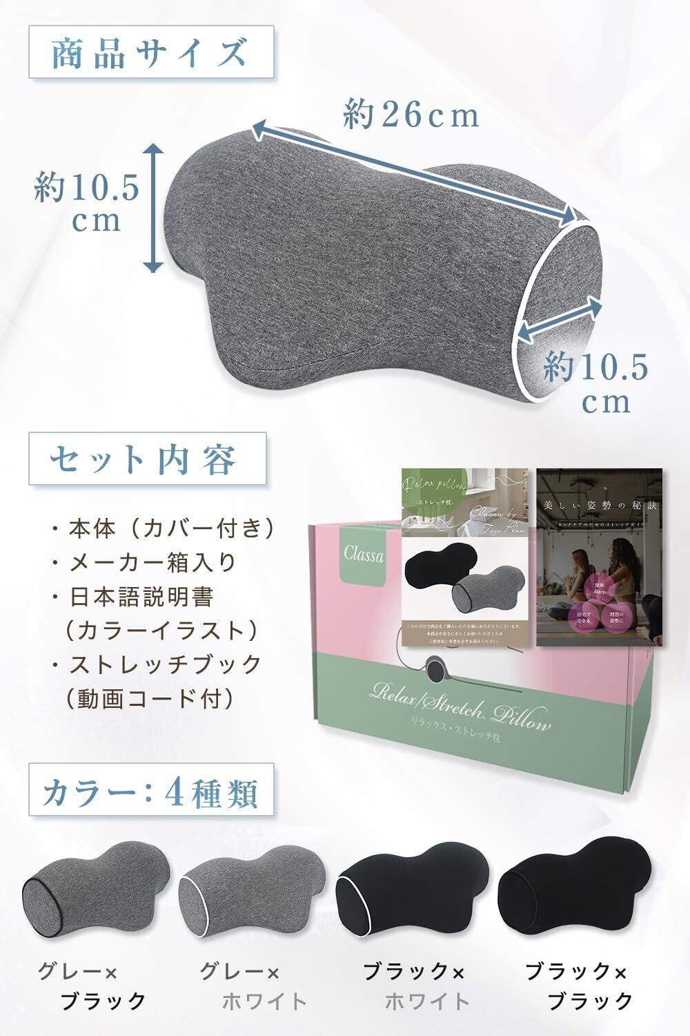 首枕 ストレッチ 首 【メディアで話題】 柔道整復師監修 独自密度設計 低反発 記憶形状フォーム ネック ピロー ストレート 肩 肩甲骨 リラックス 美姿勢ストレッチガイドブック付 Classa クラッサ (ブラック*ホワイト)