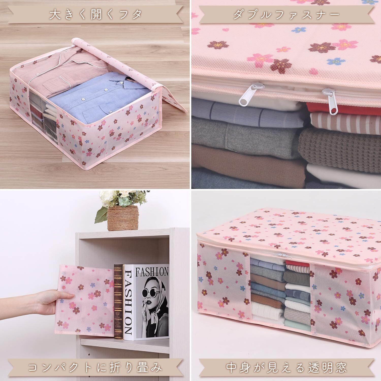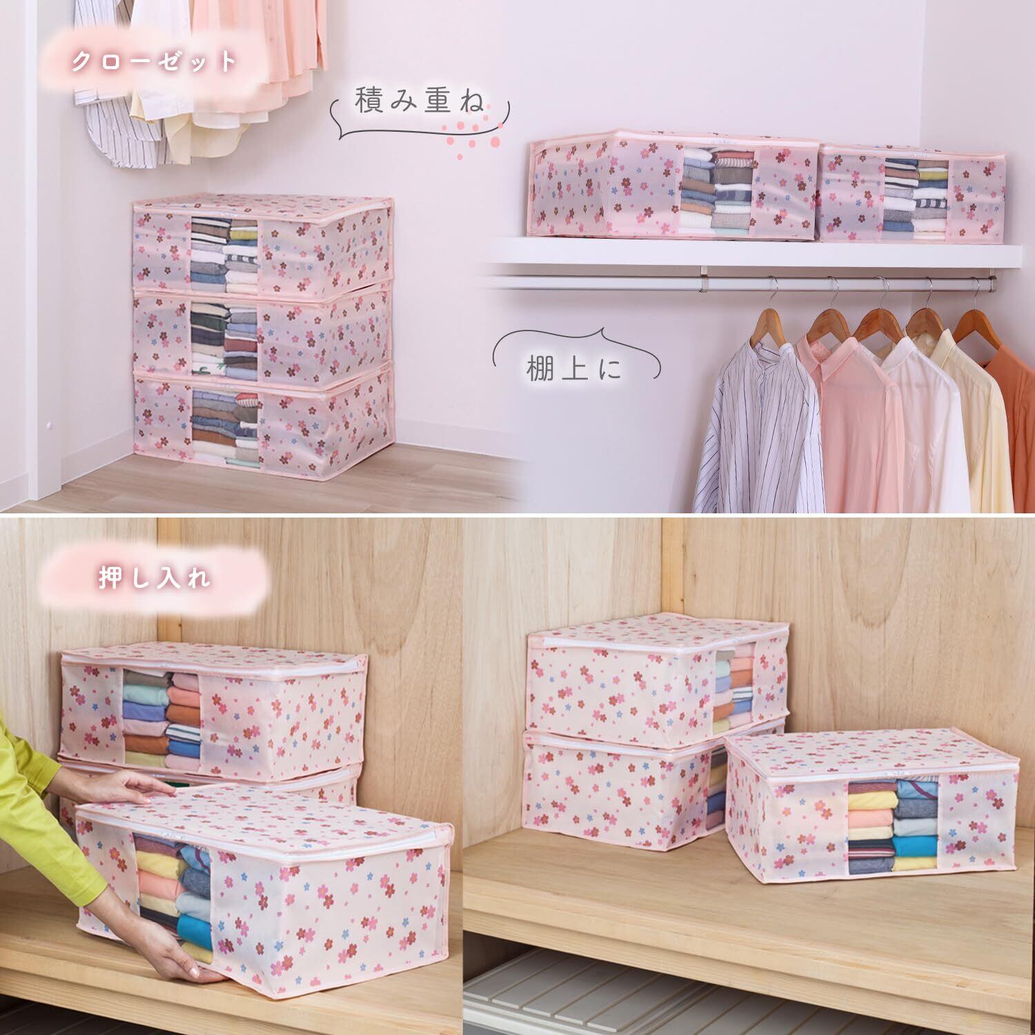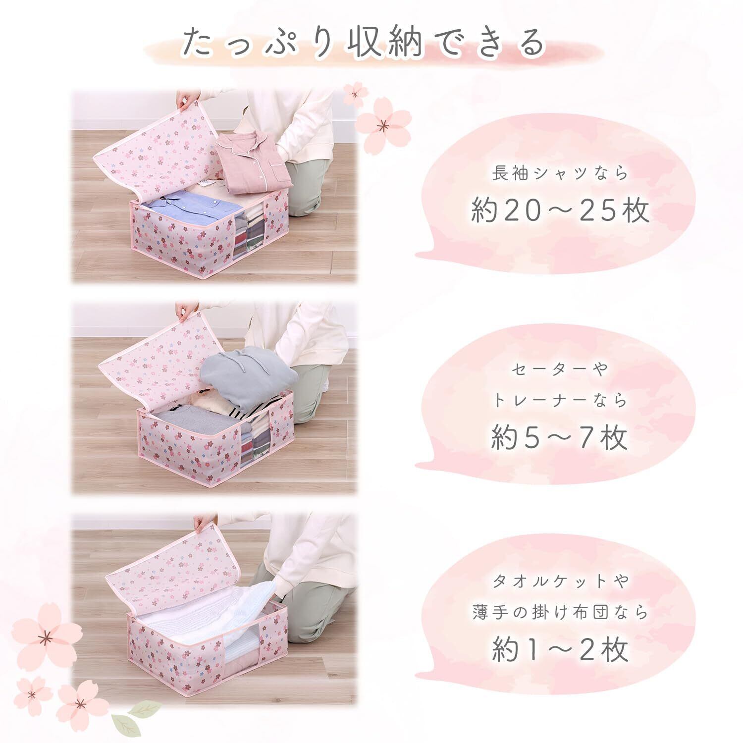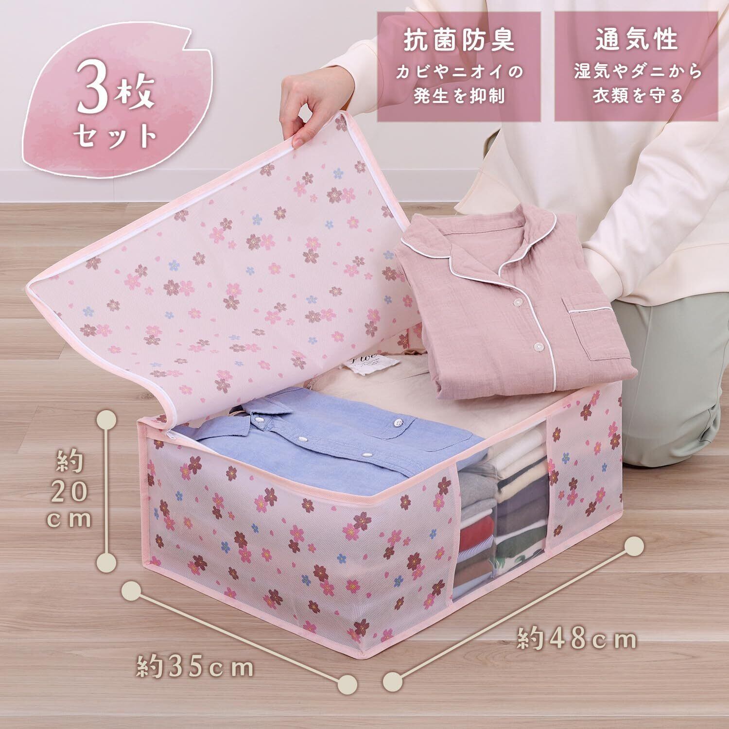 【商品仕様】:サイズ/約幅48×奥行35×高さ20cm、カラー/ピンク、柄/さくら柄、内容/3個、収納目安/薄手シャツ:約20~25枚・厚手セーター:約5~7枚、材質/ポリプロピレン(抗菌剤練り込み)・ポリエチレン