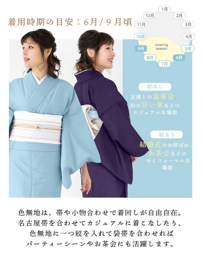【シーンを選ばないデザイン!】フォーマルな場面でもカジュアルなお出かけでも、幅広いシチュエーションにマッチするデザインです。結婚式やパーティーなどの特別な日にも、友人とのお出かけにもお使いいただけます。色無地の良さを最大限に引き立てる一着です。