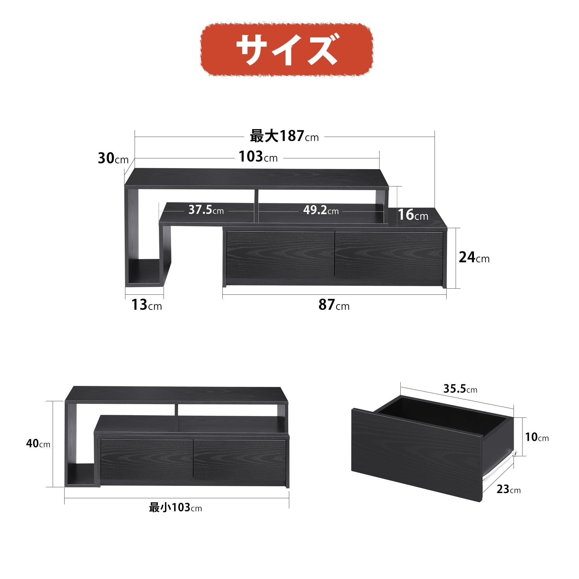 【自由な横幅】横幅が103~187cmの間で自由に調節出来る伸縮機能付きのテレビ台です。最大47Vのテレビを対応できます。