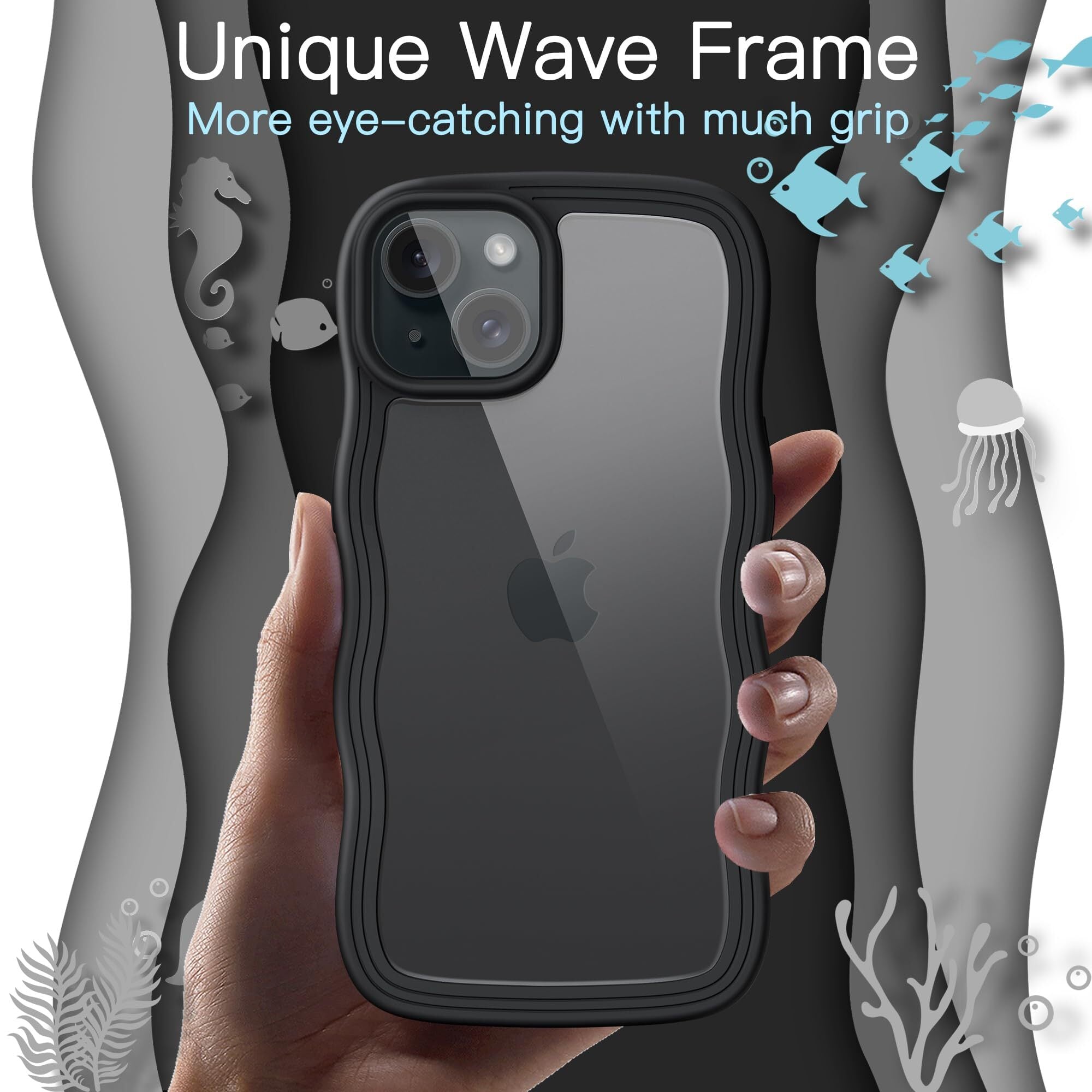 JETech iPhone 15 6.1インチ用 かわいい ケース 波状フレーム うねうね 耐衝撃 スマホカバー 女性用 女子向け クリア ハードPCバック (ブラック)
