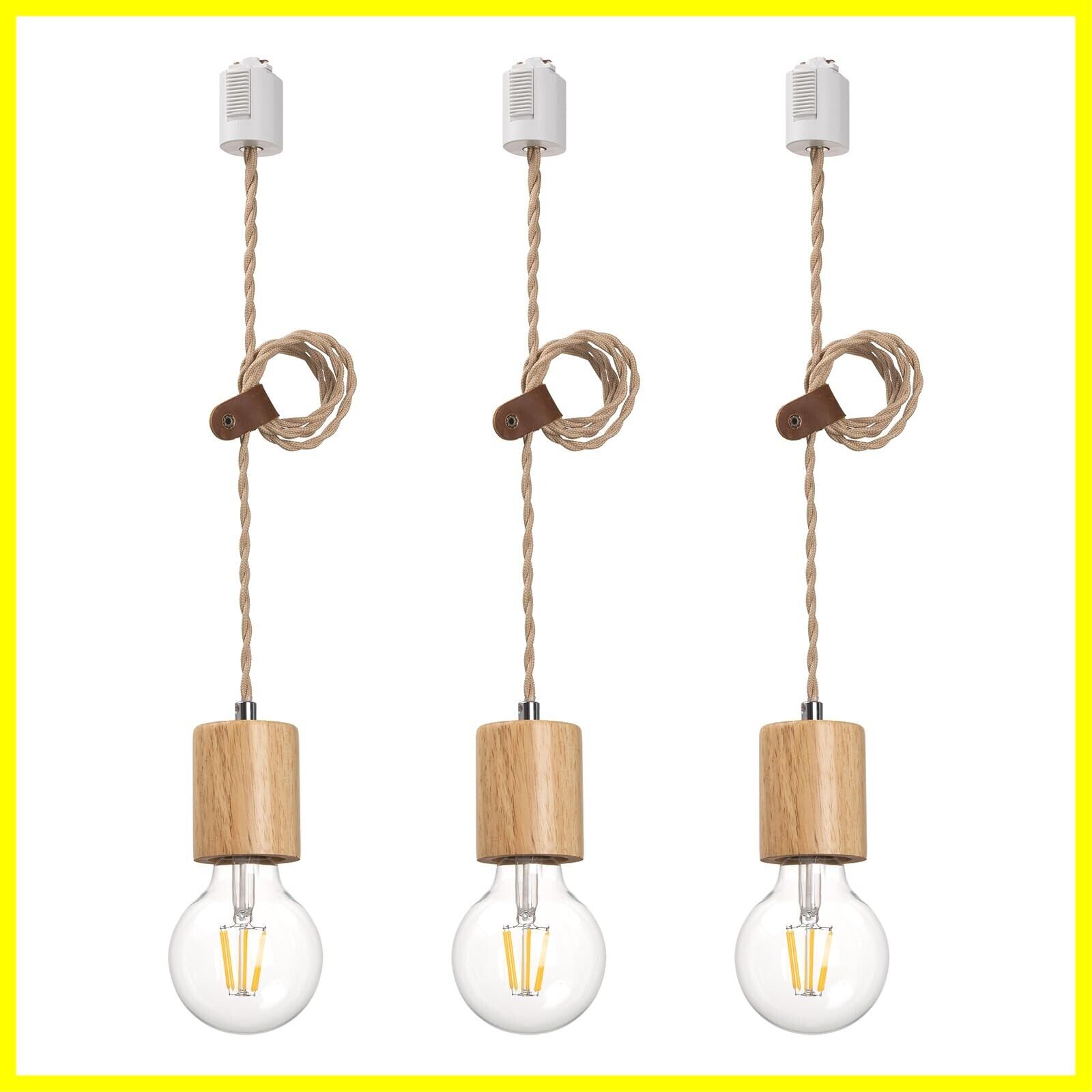 天然木 ペンダントライト 裸電球 E26口金ソケット ナチュラルカラー 吊り下げライト 本革コードホルダー付き 工事不要 (ダクトレール用・電球別売・3灯セット)