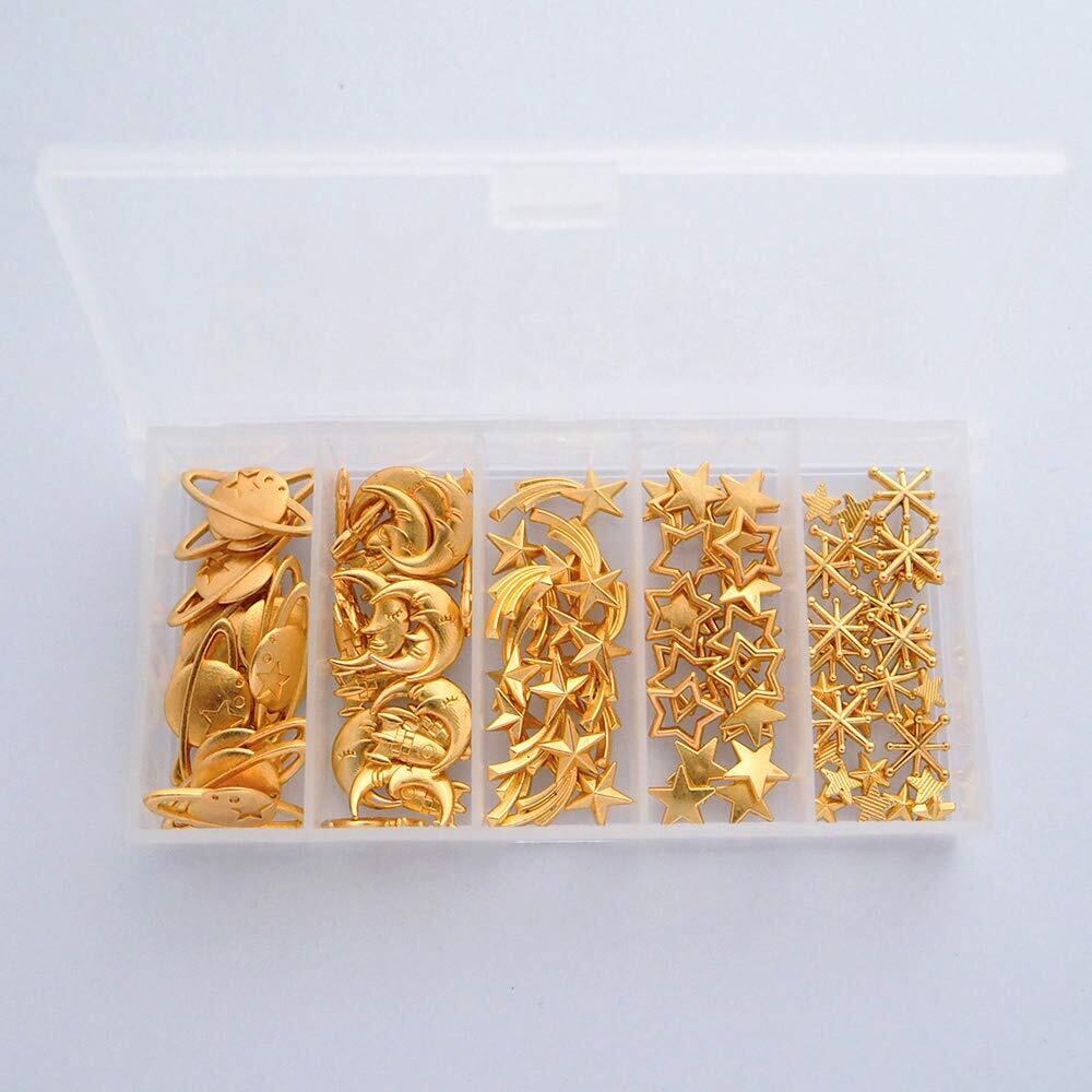 sempiterno レジン 封入材 星 月 土星 ロケット 天体 宇宙モチーフ バラエティチャームセット 大容量mix メタル uv アクセサリー レジン パーツ DIY 封入 手芸材料 合金 8種 収納ボックス付き (ゴールド)