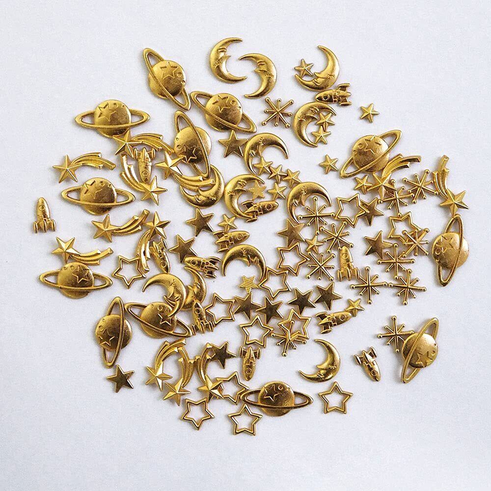 素材:亜鉛合金。カラー:ゴールド、シルバー、金古美、ローズゴールド。惑星、星、月、土星にロケットなど宇宙や天体の封入材詰め合わせセットです。