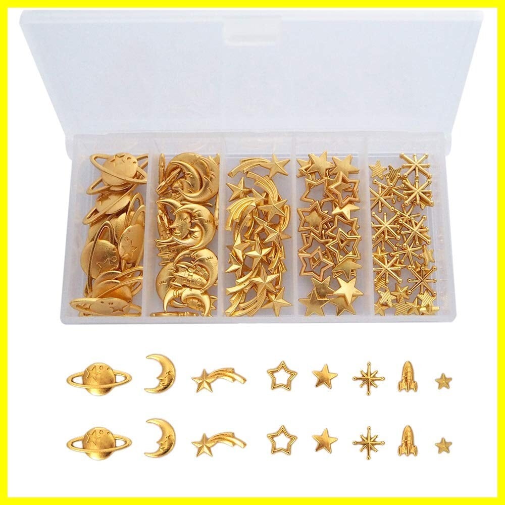 [sempiterno レジン 封入材 星 月 土星 ロケット 天体 宇宙モチーフ バラエティチャームセット 大容量mix メタル uv アクセサリー レジン パーツ DIY 封入 手芸材料 合金 8種 収納ボックス付き (ゴールド)]
