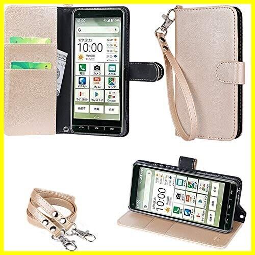 wisers BASIO4 KYV47 かんたんスマホ2 A001KC / かんたんスマホ2プラス A201KC 対応 手帳型スマホケース (ゴールド) 牛革調PUレザー (カードホルダー/スタンド機能付き) ストラップ 2種付き プレゼント