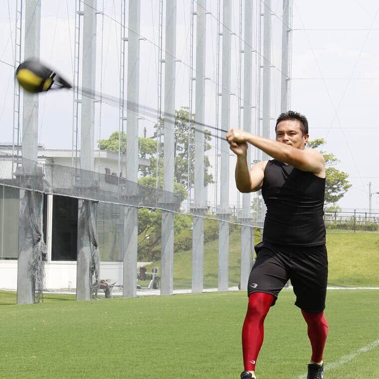 直径19~32cm、重量1~6kgまでのメディシンボールに対応し、スウィングして振り回すことで体幹を鍛えたり投てき競技のターン練習が可能