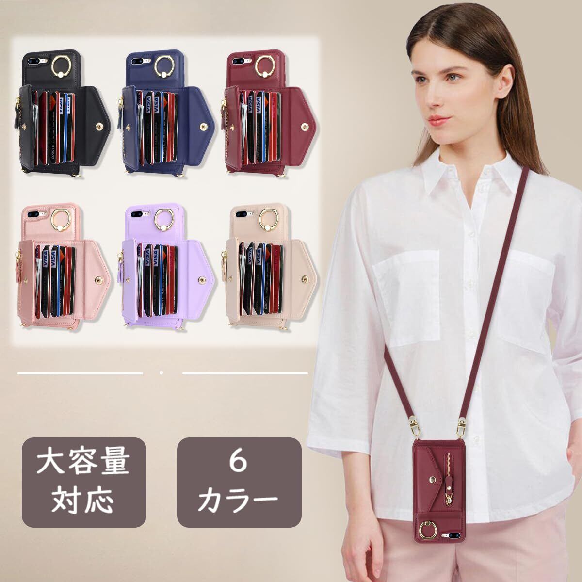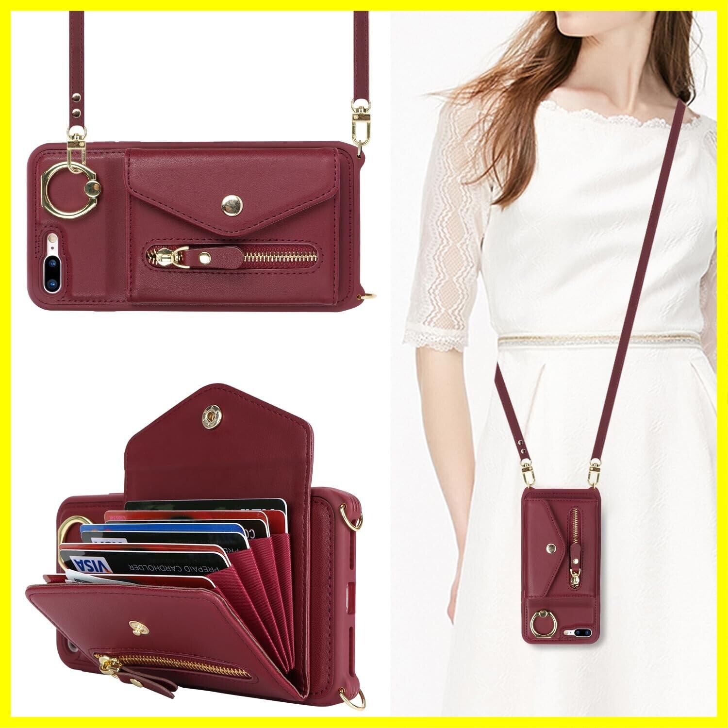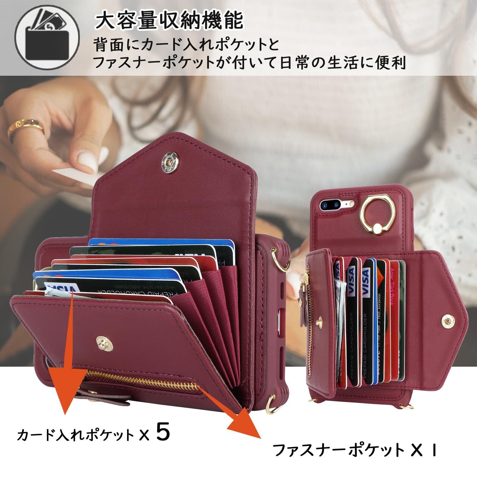 [Hamany 対応 iPhone 8 plus ケース スマホ ショルダー iphone 7 plus ケース 手帳型 ショルダー おしゃれ カード収納 大容量 背面 リング付き スタンド機能 アイフォン8プラス ケース 耐衝撃 耐久性 女性 肩がけ 首掛け 斜め掛け ストラップ付き 長さ調整可能 カバー -ワインレッド]