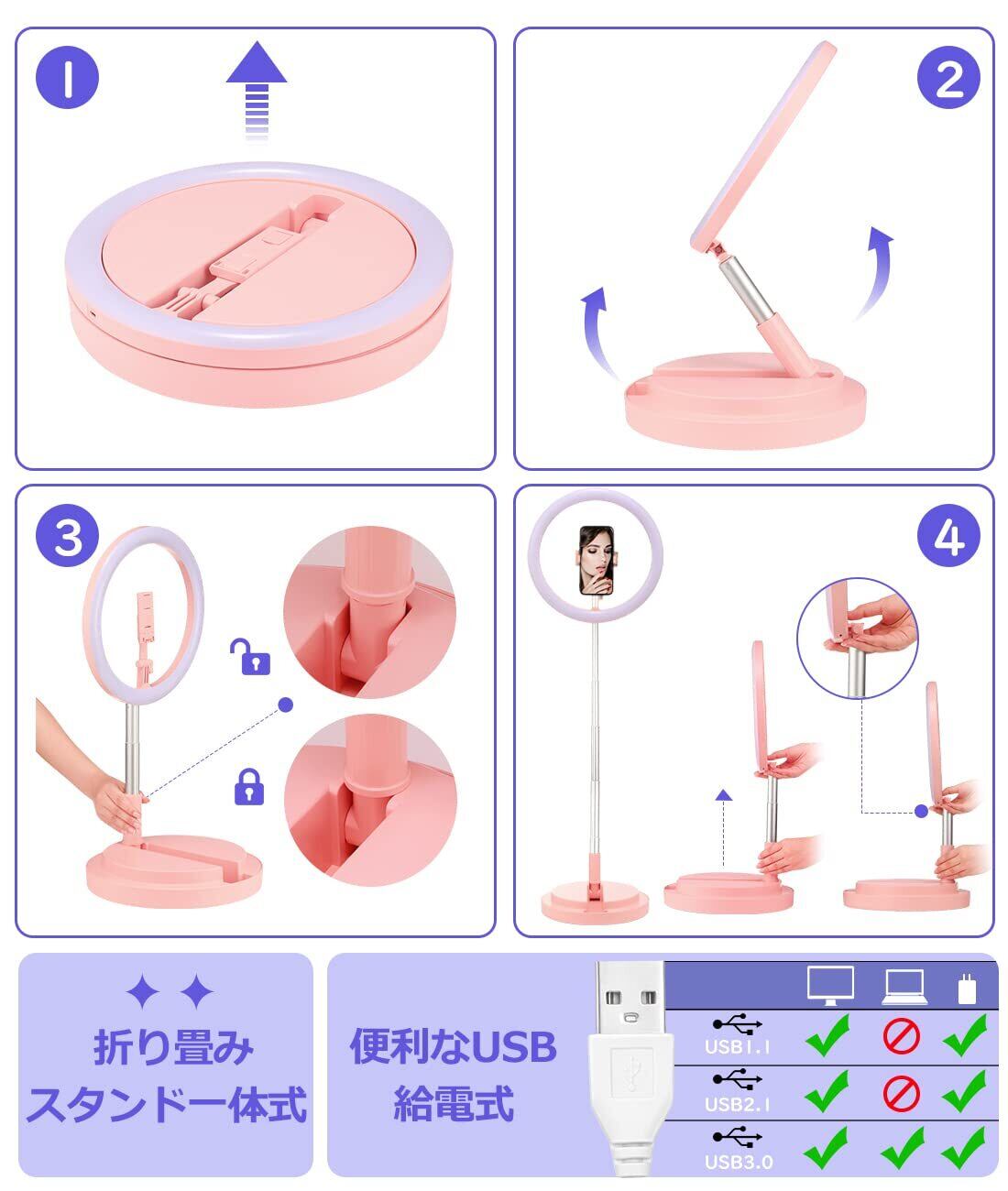 LEDリングライト 折りたたみ一体式 【アップグレード版】 Sunnila 卓上地面両用 リングライト 撮影用 自撮り用 配信用ライト 俯瞰撮影対応 11.4インチ 3色モード 10段階調光 卓上スタンド USB給電式 テレワーク/web会議/Youtubeビデオ/TIKTOK/自撮り/生放送/化粧/Zoom/美顔ライト/カメラ撮影に適用 日本語取扱 (ピンク)
