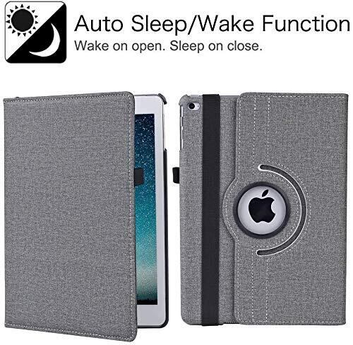 [iPad 9.7 2018/2017ケース 新型(Newモデル)/iPad Air/iPad Air2カバー iPad 9.7インチ(第6、5世代)軽量 手帳型 360度回転スタンド オートスリープ機能 3段階調節可能 固定バンド 脱落防止耐衝撃 耐久性 おしゃれデニム生地 (グレー)]