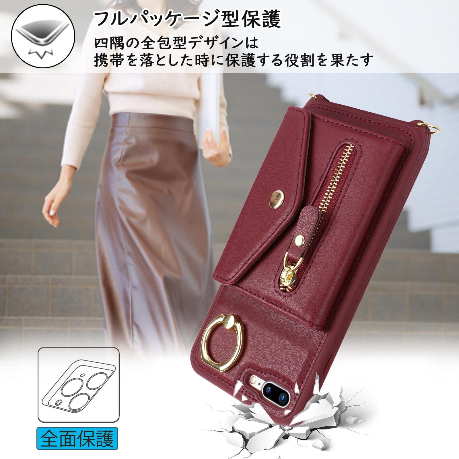 [【Hamany】 対応 iPhone 8 plus ケース スマホ ショルダー iphone 7 plus ケース 手帳型 ショルダー おしゃれ カード収納 大容量 背面 リング付き スタンド機能 アイフォン8プラス ケース 耐衝撃 耐久性 女性 肩がけ 首掛け 斜め掛け ストラップ付き 長さ調整可能 カバー -ワインレッド]
