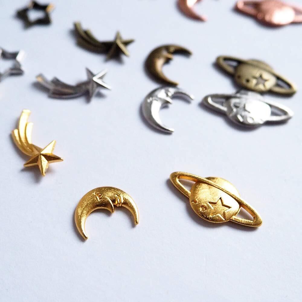 素材:亜鉛合金。カラー:ゴールド、シルバー、金古美、ローズゴールド。惑星、星、月、土星にロケットなど宇宙や天体の封入材詰め合わせセットです。