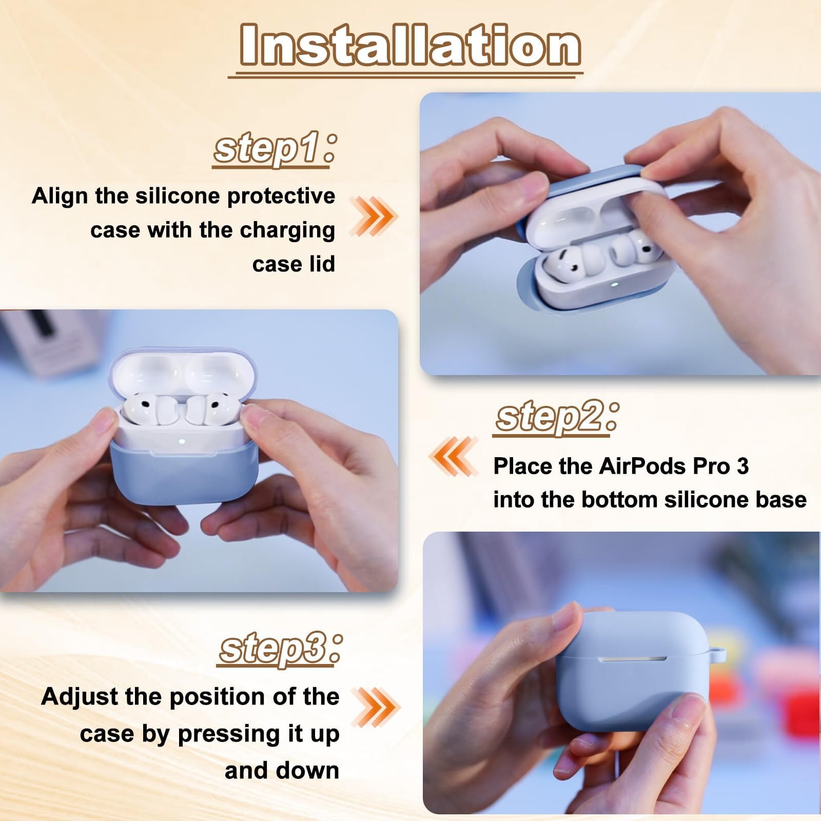 対応機種:AirPods Pro 3 用 ケース(第3世代、2025年秋発売モデル専用)。 カラビナ&シリコン製ストラップが付属します。 取り付け手順:1.AirPods Pro 3 と保護ケースを準備 ➡2.AirPods Pro 3 の蓋を開ける ➡3.ポイント:まず蓋の部分を取り付け(シリコンケースと AirPods Pro 3 の蓋の縁を合わせ込む) ➡4.次に本体部分を取り付け ➡5. 隙間がある場合は、軽く押さえたり引っ張ったりして、完全にフィットするまで調整する。 ご注意:シリコン素材のため、轻微な隙間は自身で調整可能。万一調整できない場合や不具合があれば、いつでも返品・交換対応する。