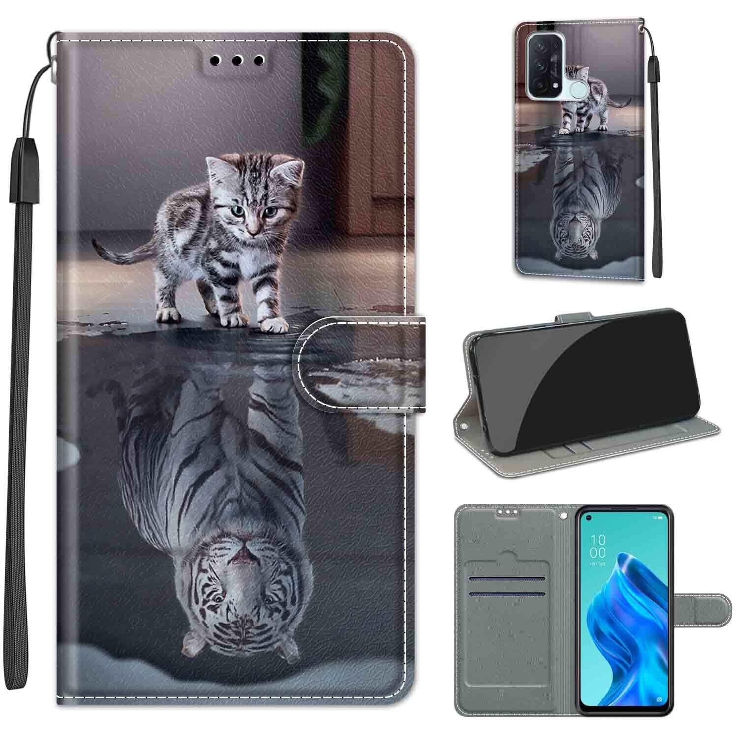 OPPO Reno5 A ケース 手帳型 対応 オッポ ネノ5 A ケース カバー A1010P スマホケース CPH2199 収納 耐衝撃 耐久性 耐摩擦 マグネット式 レザー カバー (猫と虎)