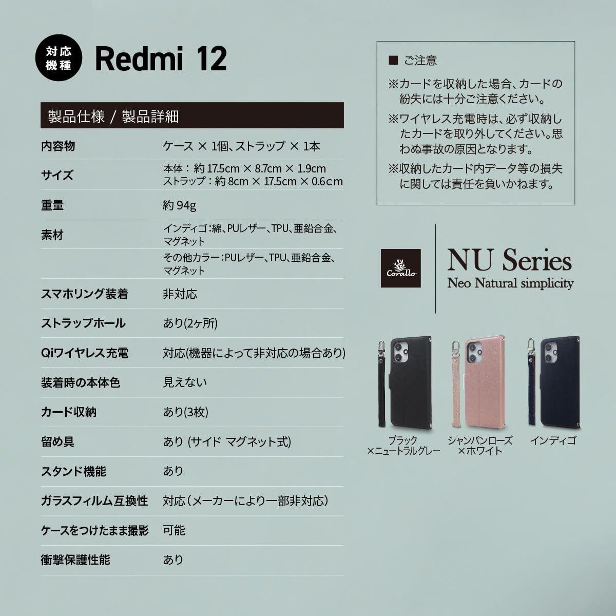 【製品仕様】… ◆ 対応機種 : Xiaomi redmi12 シャオミ レッドミー 12 5G ◆ 内容物 : ケース × 1個、ストラップ × 1本 ◆ サイズ : 約 17.5cm × 8.7cm × 1.9cm ◆ 重量 : 約 94g ◆ 素材 : インディゴ:綿、PUレザー、TPU、亜鉛合金、マグネット その他カラー:PUレザー、TPU、亜鉛合金、マグネット