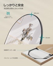 アルミ合金フレームを使用したこの姿見鏡は、軽量でありながら頑丈で、長くご愛用いただけるデザインになっています。飛散防止加工も施されているため、安全面もばっちり!アーチ型の優雅なフォルムが、お部屋全体をより一層引き立ててくれます。