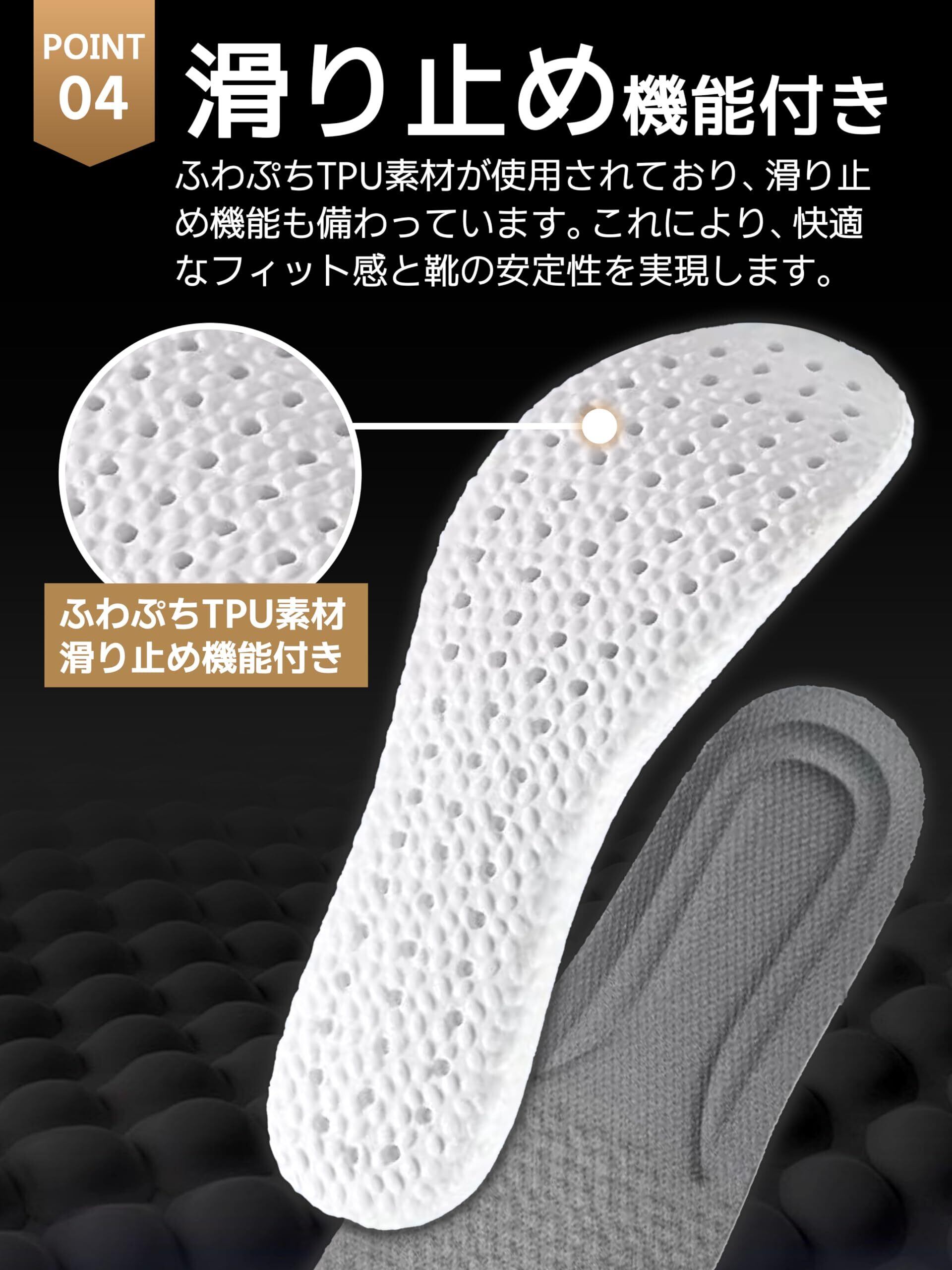 【衝撃吸収】衝撃吸収を高反発素材を全面に採用。特に衝撃がかかる踵だけでなく、足全体に高い衝撃吸収性と反発性を発揮し、ランニングやトラッキング、フィットネスジムでの運動など、アクティブなスポーツに最適な素材です。抜群のクッション性を実現しています。【衝撃吸収・疲労軽減】 表面に優しい履き心地のソフトクッション、裏面には衝撃吸収ジェルパッドを搭載、生卵を受け止められる衝撃吸収力に加え、疲労感を軽減する3Dサポートが、土踏まずを支えることで体圧を分散し足の疲れや痛みを軽減します