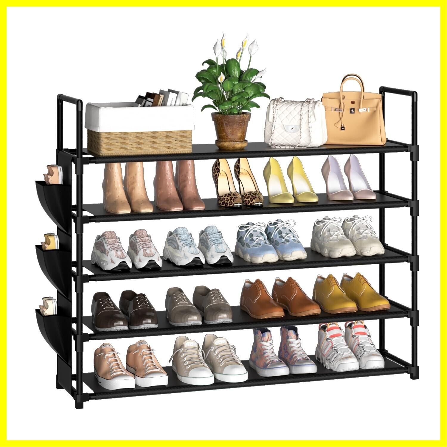 大容量ロングシューズラック:この 5 段階ブラックシューズラックにはサイドポケット付きで豊富な収納スペースを備えており、幅 84.5 x 奥行き 28.4 x 高さ 90.4cm (33.3 x 11.2 x 35.6インチ)のサイズで、20~25 足の靴を収納可能です。各棚に 4~5 足の靴を収納できる、エントランスに最適な靴収納オーガナイザーです。