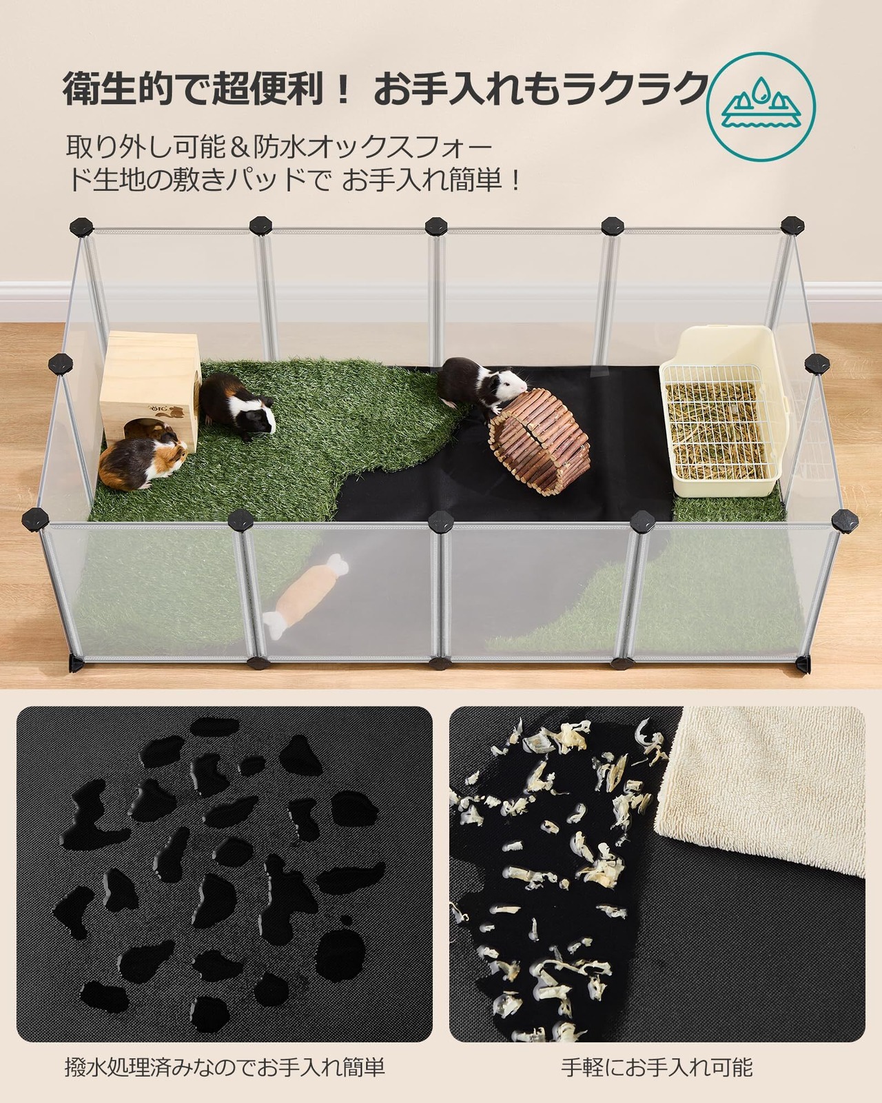 【二重保護設計】 PP製の床板と取り外し可能な防水シートが、床を保護します。サイドパネルと床板の接続部分は強化されており、安定性が向上するとともに、ペットの脱走を防ぎます。